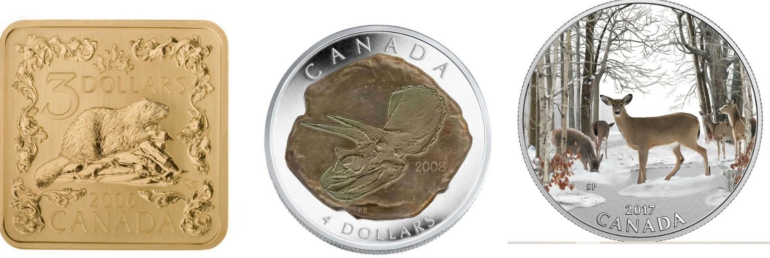 2006 $3 Square Sterling Silver Coin- The Beaver, 2008 $4 Triceratops, and 2017 $10 Iconic Canada: Spring Sightings.