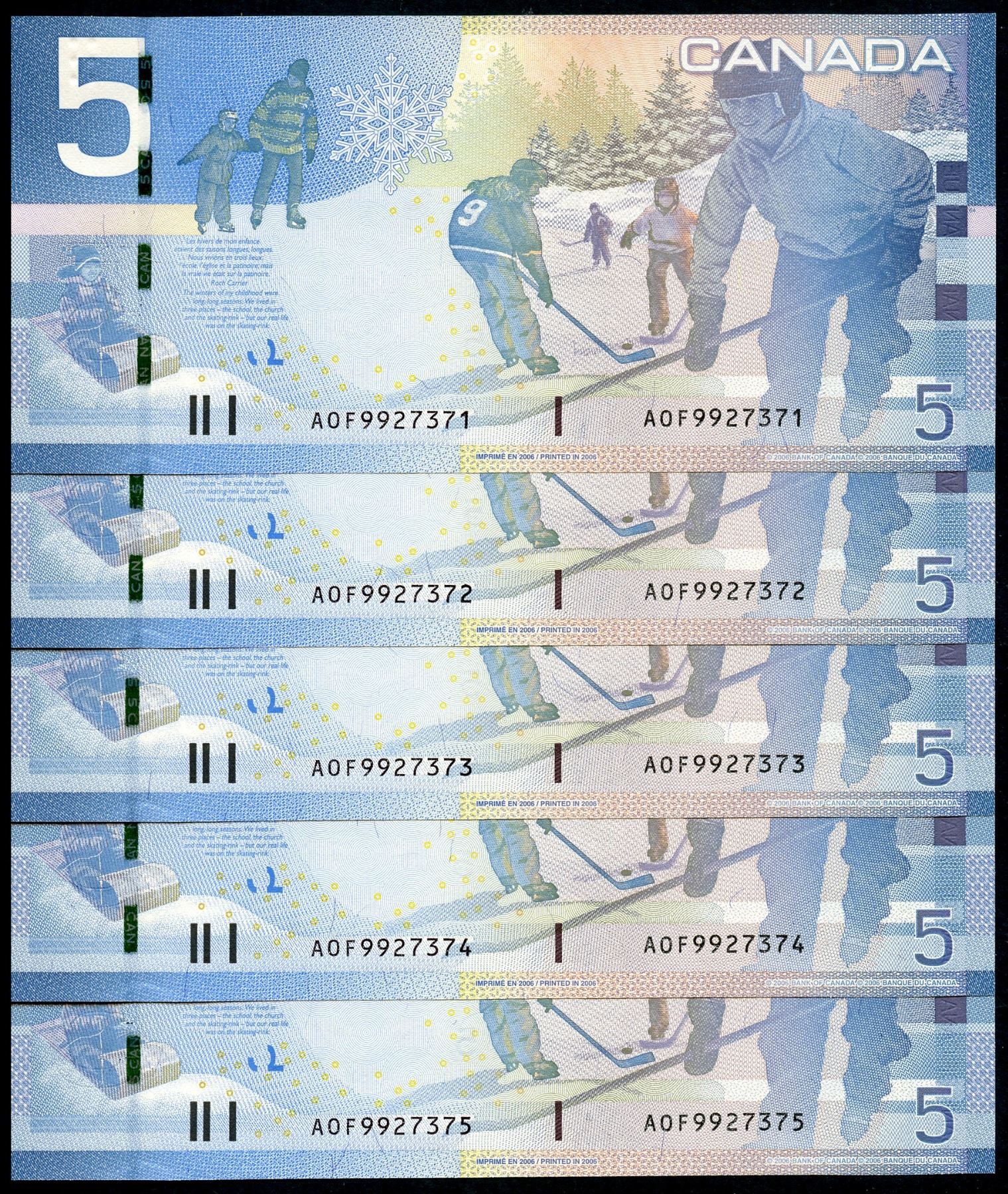 2006 $5 BC-67a #AOF9927371-375. Lot of 5 consecutive and original UNC.