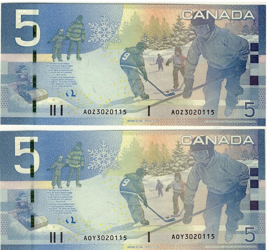 2006 $5 BC-67a #AOY3020115 & #AOZ3020115. Lot of 2 UNC notes with same serial number.
