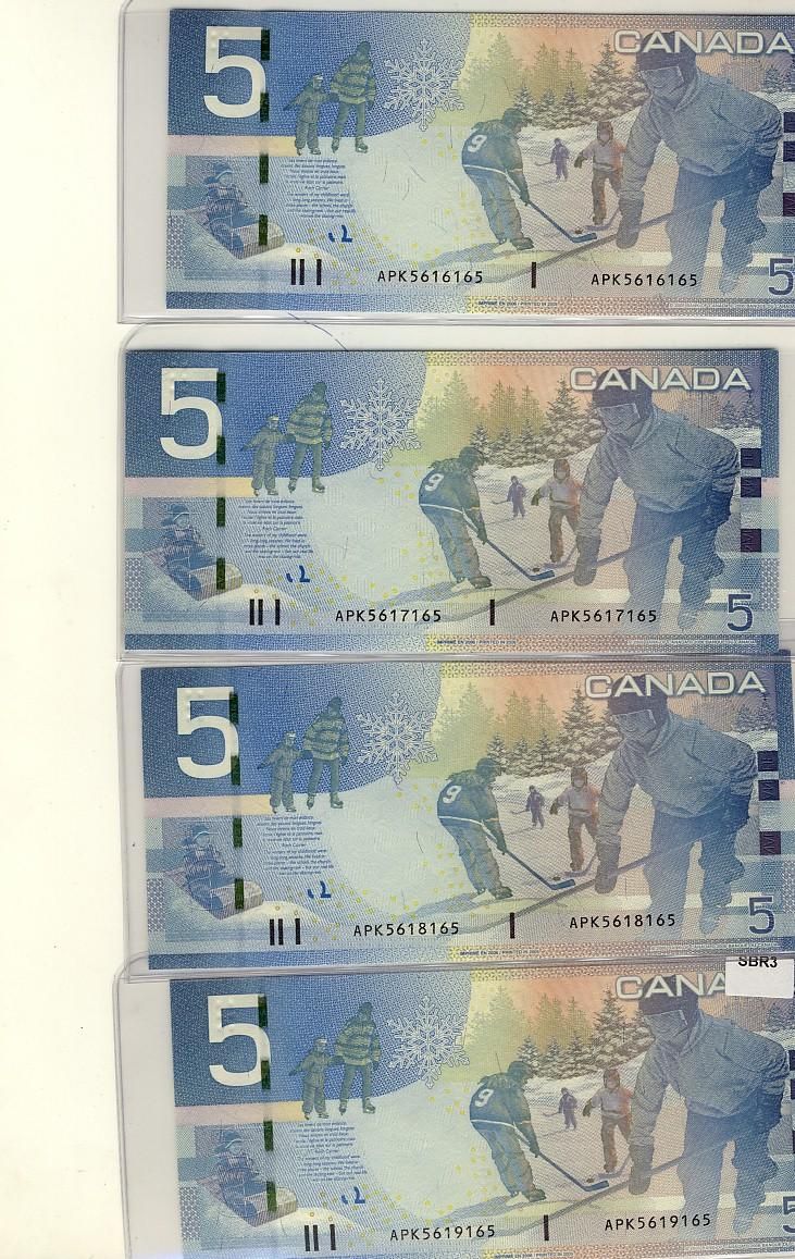 2006 $5 BC-67a #APK5616165, #5617165, #5618165 & 5619165. Lot of 4 consecutive RADAR notes. Choice