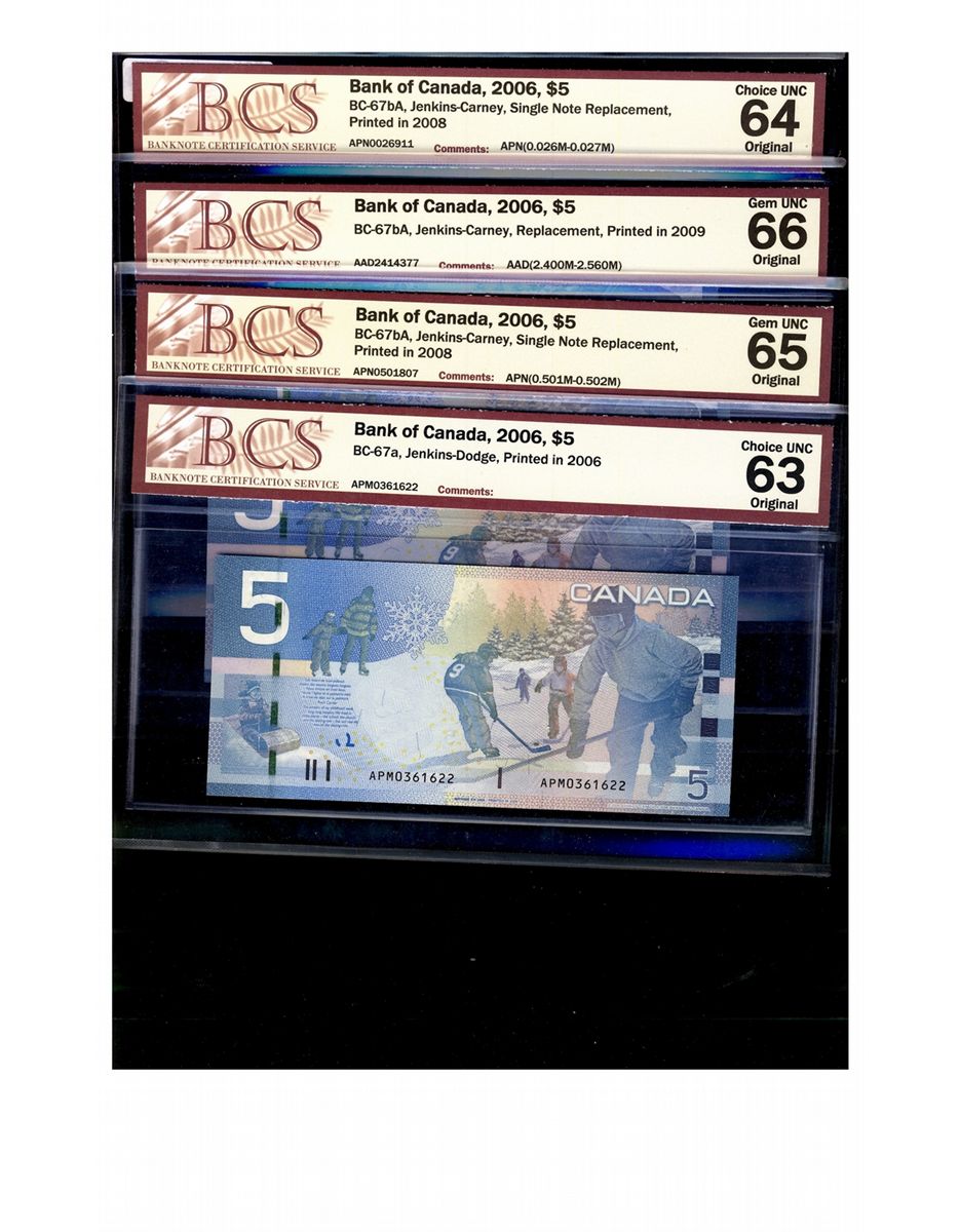 2006 $5 BC-67a, #APM CH UNC-63, BC-67bA, #APN(0.501M-0.502M) GemUNC-65, #AAD(2.400M-2.560M)Gem UNC-66 & #APN(0.026M-0.027M CH UNC-64. Lot of 4 BCS graded Original notes.
