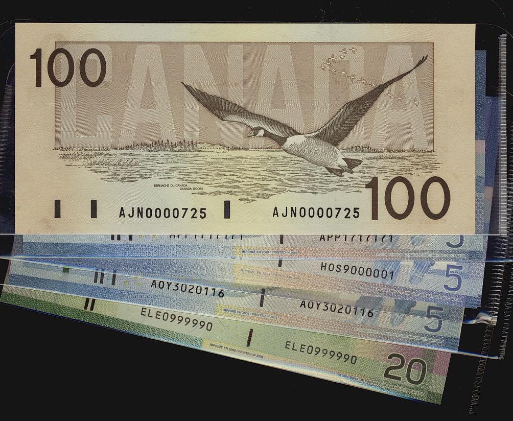 2006 $5 BC-67a. Lot of two notes with same serial number #AOY3020116 and AOZ3020116. Lot also includes 2002 $5 BC-62b (5) consecutive odd numbers #HOS9000001 to HOS9000005. 2006 $5 BC-67a RADAR #APP1717171 and 2006 $20 BC-64ai RADAR #0999990 and 1988 $100 BC-60a low serial number #AJN0000725, Lot of 10 notes in all. Original UNC.