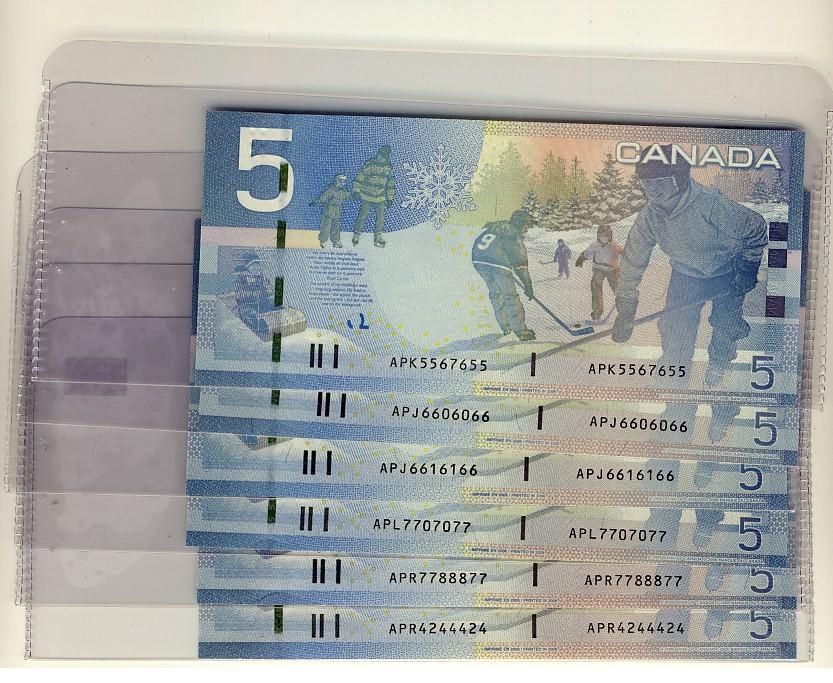 2006 $5 BC-67a RADARs, #APG0111110, #APH3999993, #APU4333334, #APJ4777774, #APF5777775 & #APD9222229. Lot of 6 RADAR notes. Choice UNC.