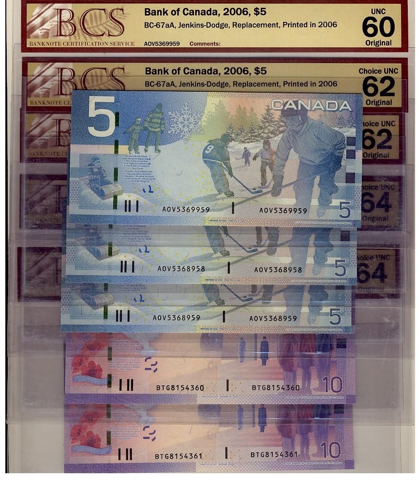 2006 $5 BC-67aA(3) & 2005 $10 BC-68aA(2). Lot of 5 replacement issues all BCS graded. UNC60 to UNC64.