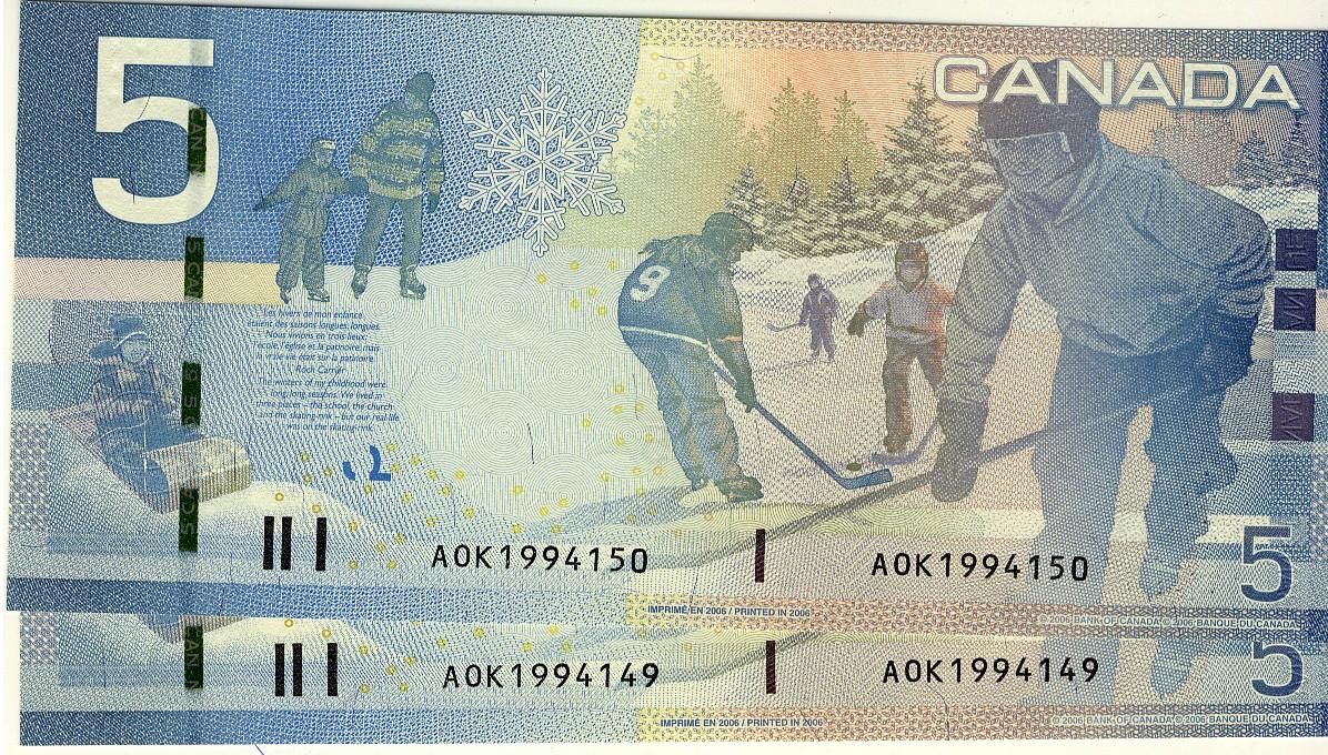 2006 $5 BC-67aA #AOK1994149,50, Lot of 2 consecutive notes, All UNC