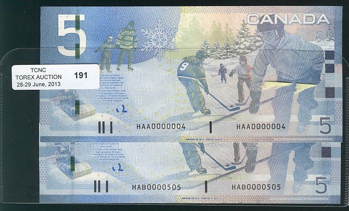 2006 $5 BC-67b-i #HAB0000505 & HAA0000005. Lot of 2 low serial number notes both sharp EF.