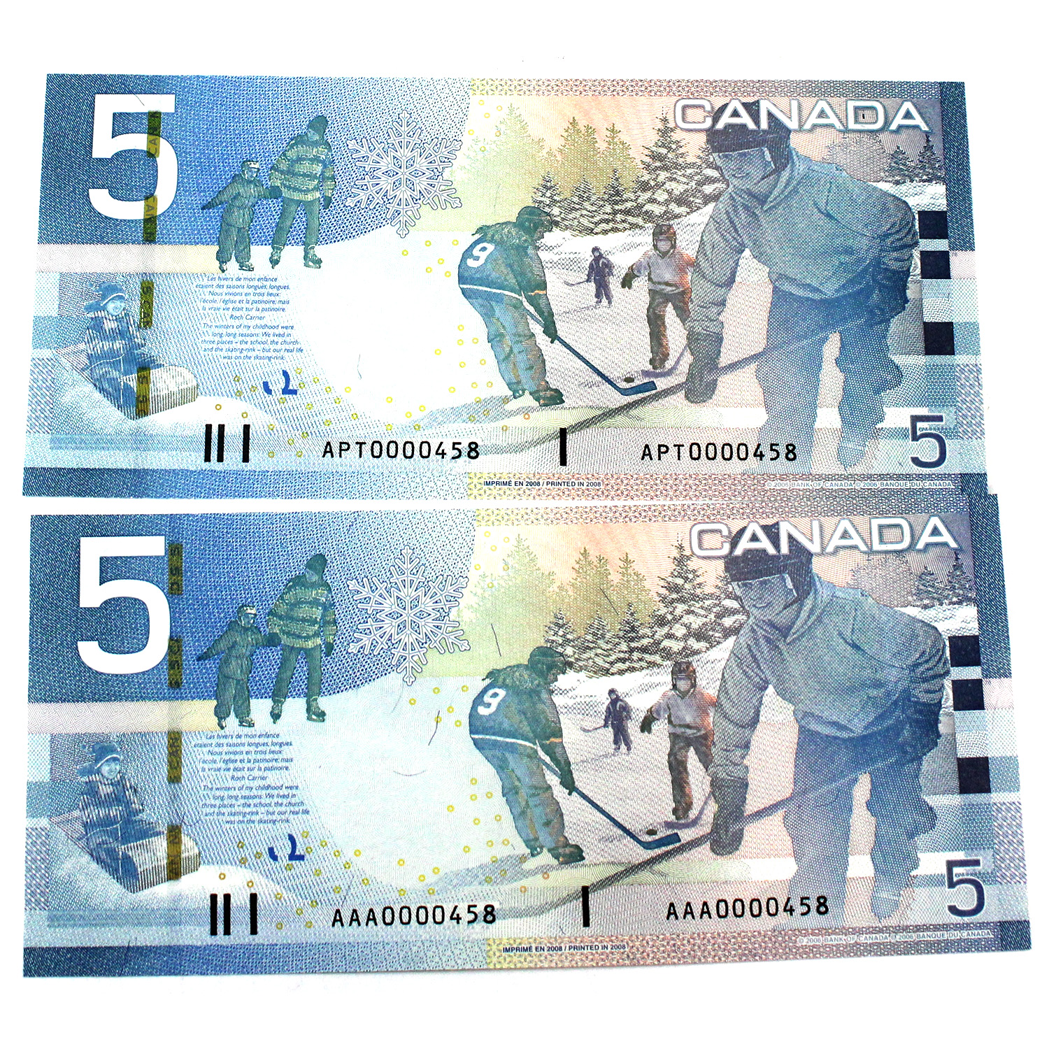 2006 $5 Journey Series Matching Low Serial # APT0000458 & AAA0000458 Jenkins-Carney. 2pcs.