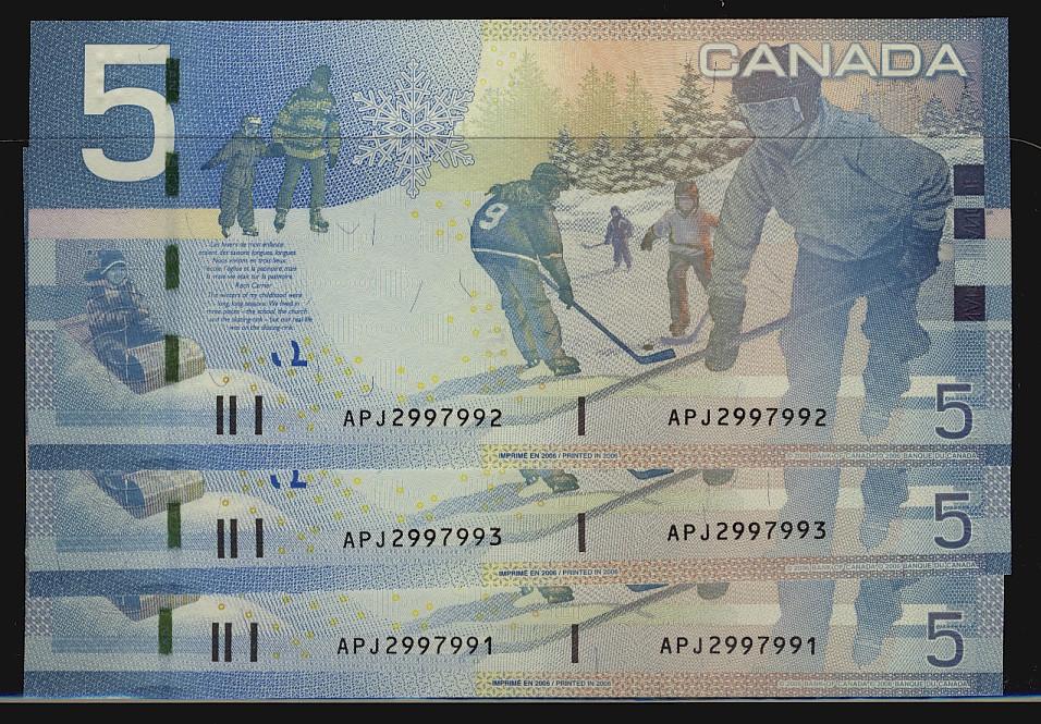 2006 $5 RADAR issue. Lot of three notes includes the RADAR and one note in sequence before and after. #APJ2997992 RADAR. Gem UNC