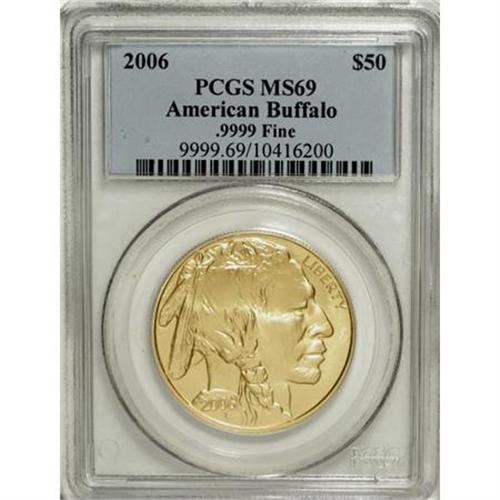 <B>2006 $50 Buffalo MS69 PCGS.</B></I> PCGS Population (4453/351). NGC Census: (0/0). Numismedia Wsl. Price for NGC/PCGS coin in MS69: $690. (#9999)<BR><BR><b>Shipping:</b> Coins & Currency (<a target="_blank" href="http://www.heritageauctions.com/common/shipping.php">view shipping information</a>)