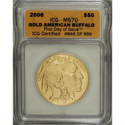 <B>2006 $50 One Ounce Gold Buffalo MS70 ICG.</B></I> First Day of Issue. NGC Census: (0/0). PCGS Population (357/0). Numismedia Wsl. Price for NGC/PCGS coin in MS70: $925. (#9999)<BR><BR><b>Shipping:</b> Coins & Currency (<a target="_blank" href="http://www.heritageauctions.com/common/shipping.php">view shipping information</a>)