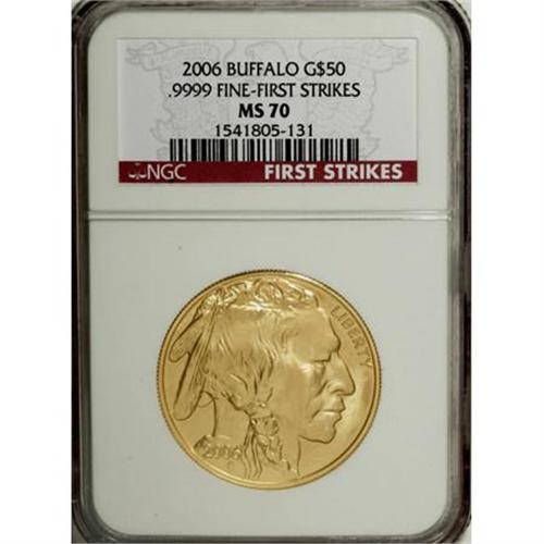<B>2006 $50 Buffalo One-Ounce Gold MS70 NGC.</B></I> .9999 Fine First Strikes. NGC Census: (41095/0). PCGS Population (3328/0). (#89999)<BR><BR><b>Shipping:</b> Coins & Currency (<a target="_blank" href="http://www.heritageauctions.com/common/shipping.php">view shipping information</a>)