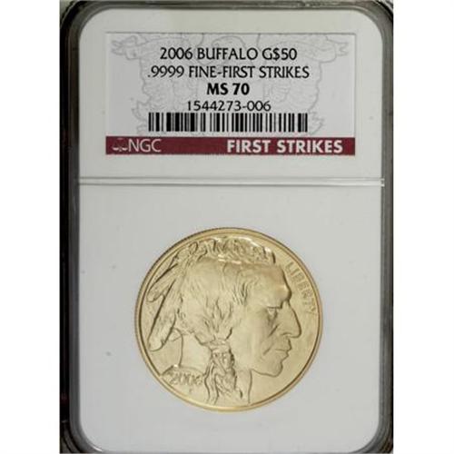 <B>2006 $50 Buffalo One-Ounce Gold MS70 NGC. </B></I> .9999 Fine-First Strikes. NGC Census: (42448/0). PCGS Population (3328/0). (#89999)<BR><BR><b>Shipping:</b> Coins & Currency (<a target="_blank" href="http://www.heritageauctions.com/common/shipping.php">view shipping information</a>)