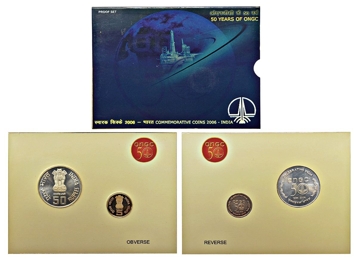 2006, 50 Years of ONGC, Proof set of 2 coins, 50 rupees and 5 rupees, Kolkata mint, RB 307, in original mint packing.
