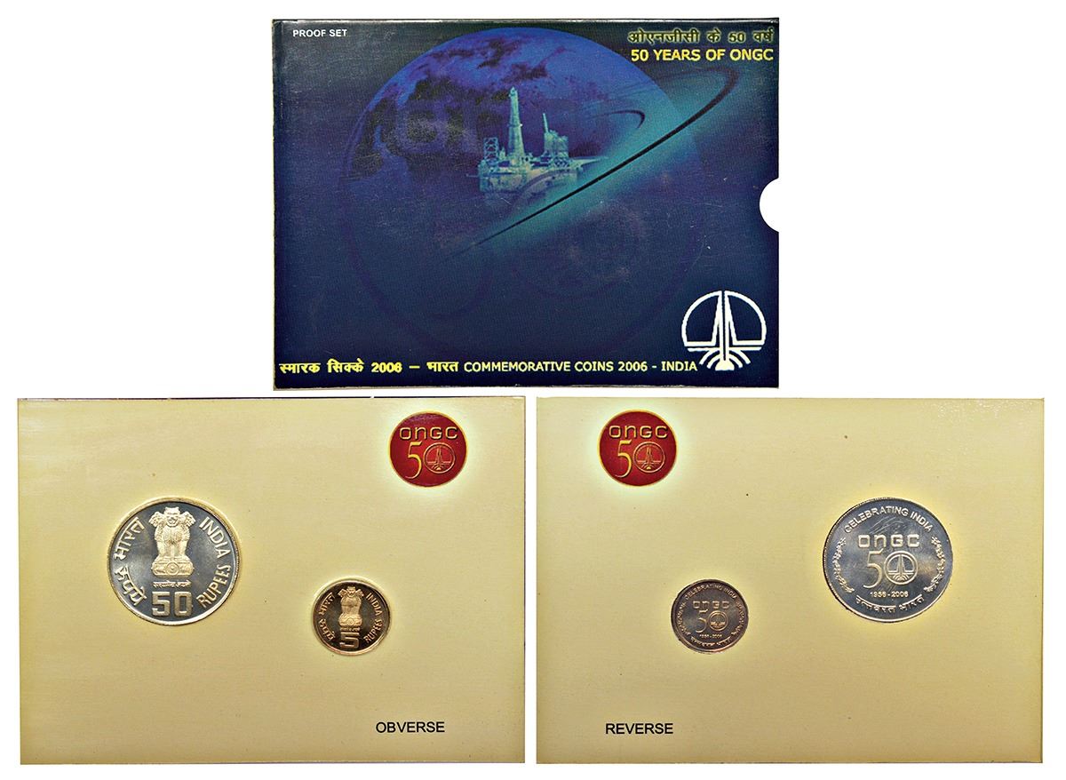 2006, 50 Years of ONGC, Proof set of 2 coins, 50 rupees and 5 rupees, Kolkata mint, RB 307, in original mint packing.