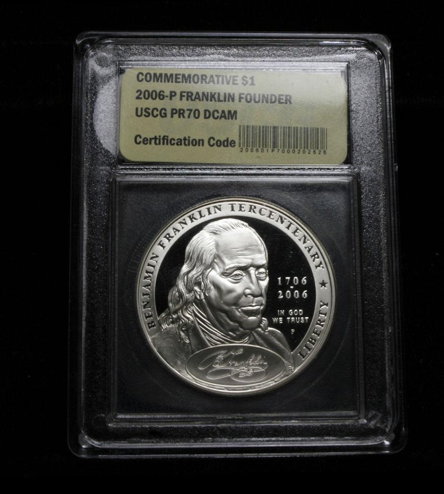 The 2006 Benjamin Franklin Silver Dollar was issued for the 300th anniversary of his birth. This proof dollar is graded PF70 DCAM by USCG. PCGS lists a PR70 Dam at $345 Estimated Value $125.