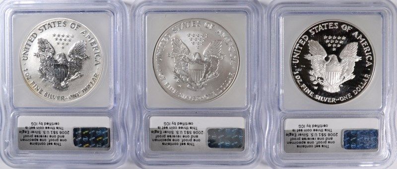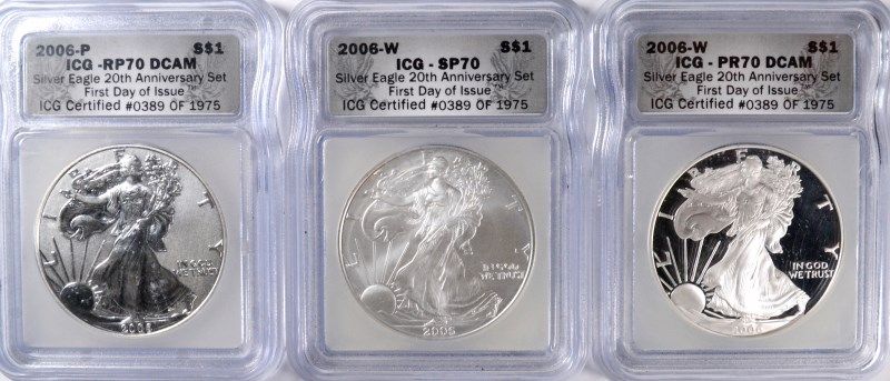 2006 AMERICAN SILVER EAGLE 20th ANNIVERSARY 3 COIN SET, ALL ICG PROOF-70 DCAM