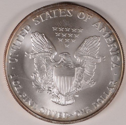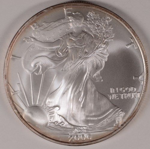 2006 AMERICAN SILVER EAGLE, BU, ONE OUNCE .999 SILVER, START OF SOME TONING
