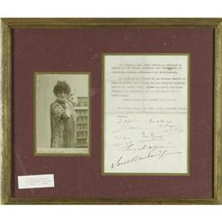 <B>Sarah Bernhardt Signed Letter With Photograph.</B></I> Primarily known for her theatrical work, French actress Sarah Bernhardt ...