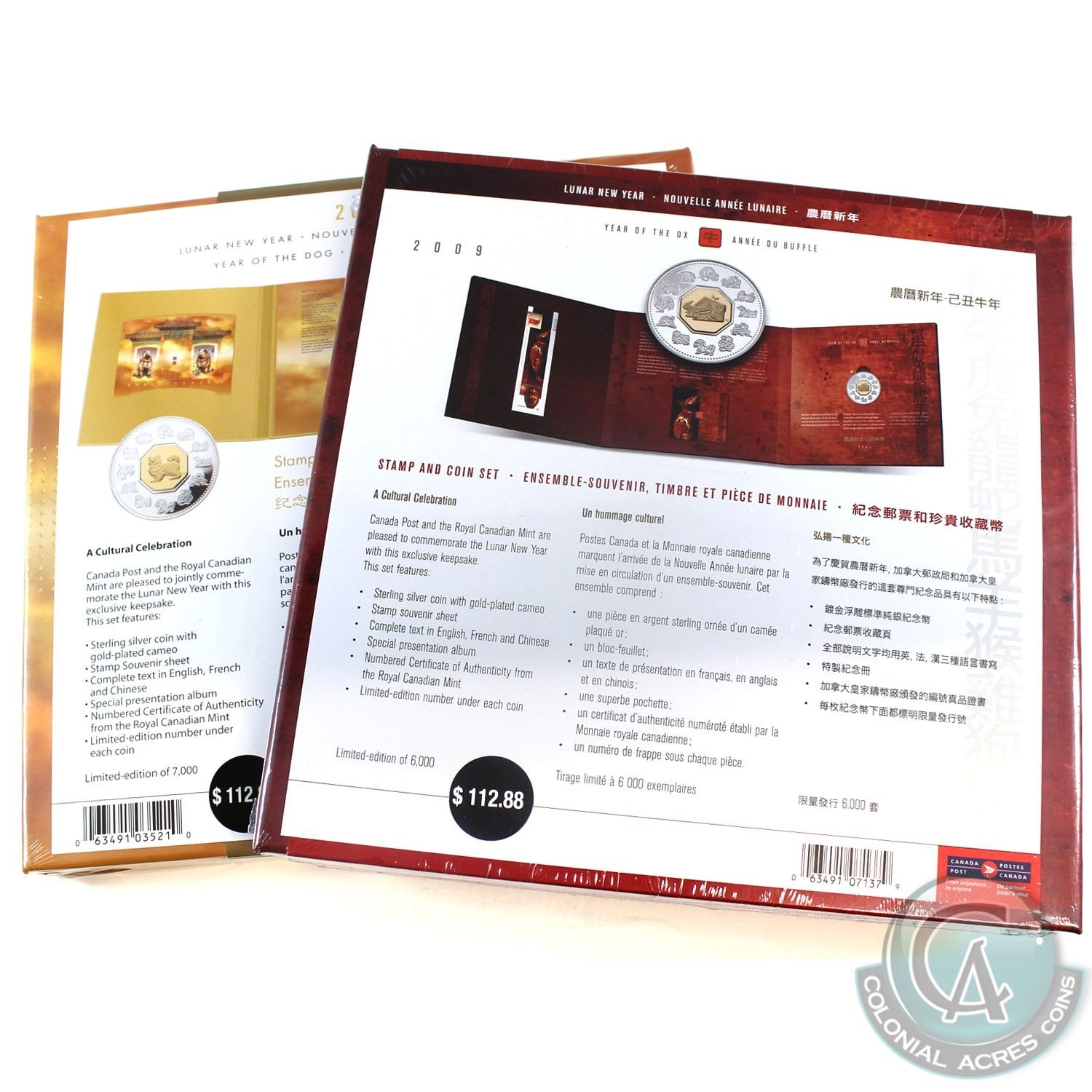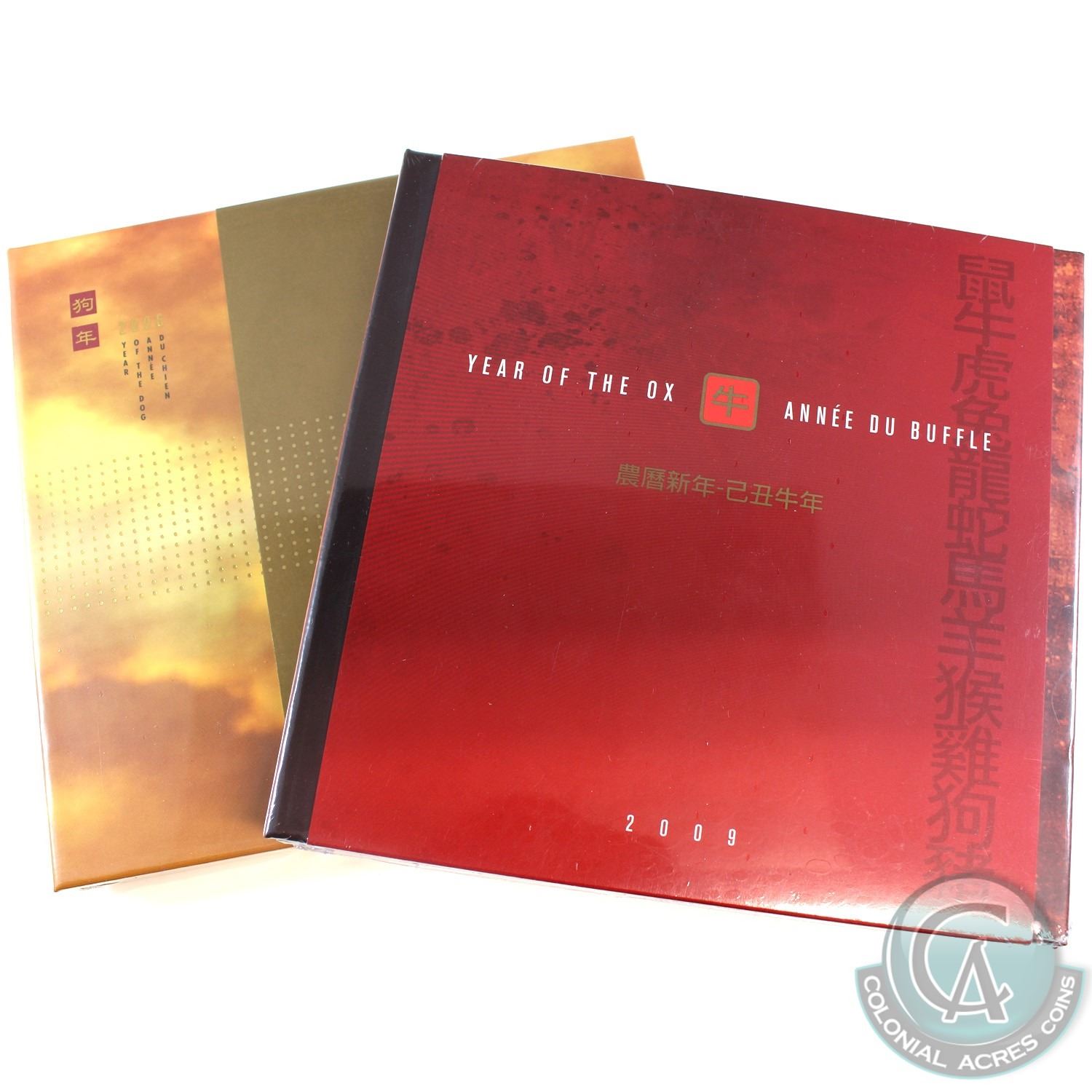 2006 Canada $15 Year of the Dog & 2009 $15 Year of the Ox Sterling Silver with Gold Plating Coin and Stamp Sets Sealed in Original Plastic. 2pcs