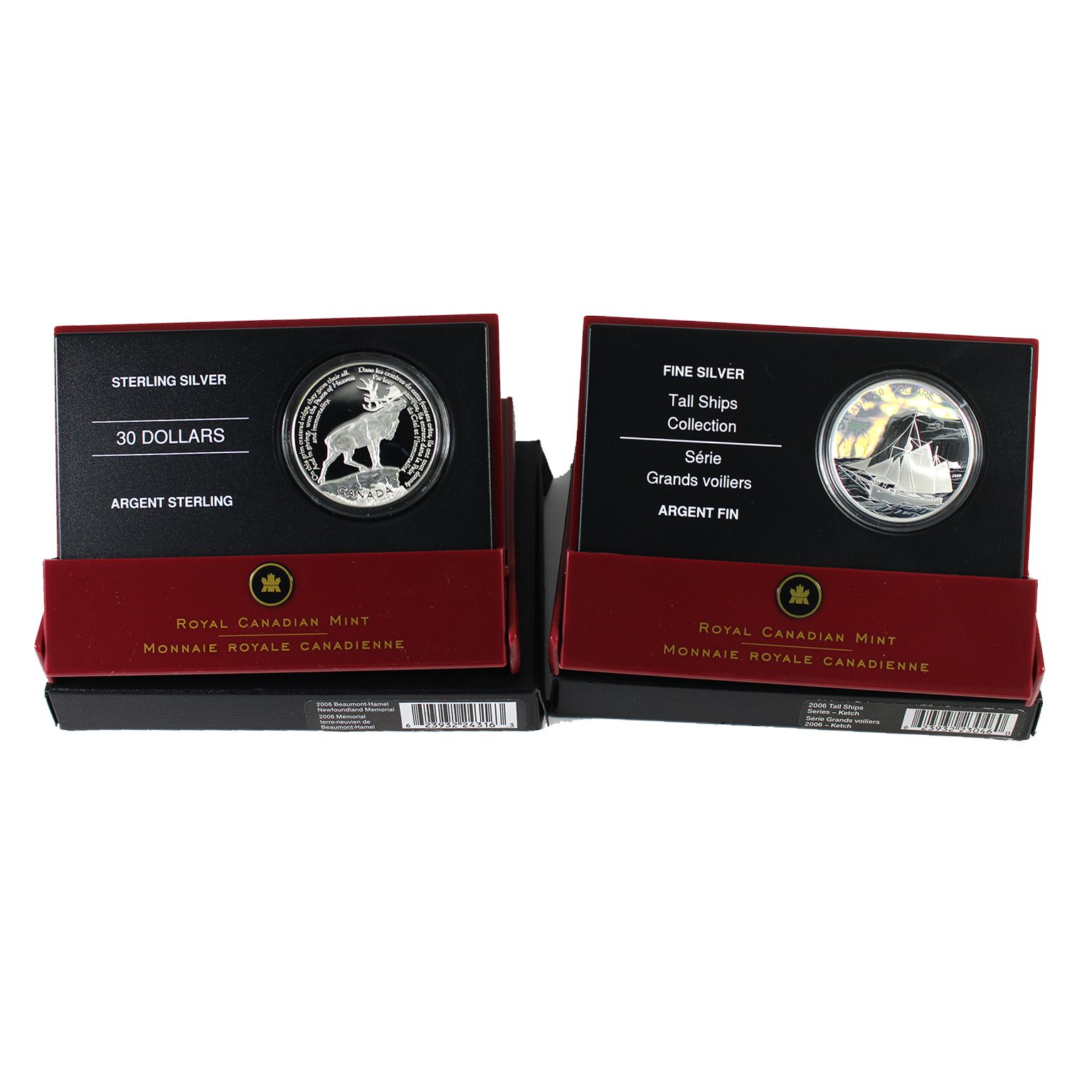 INCLUDES: $20 Tall Ships Collection - The Ketch Fine Silver & $30 National War Memorials - Beaumont-Hamel Sterling Silver. 2pcs. Toned, scuffed capsules. 2pcs.