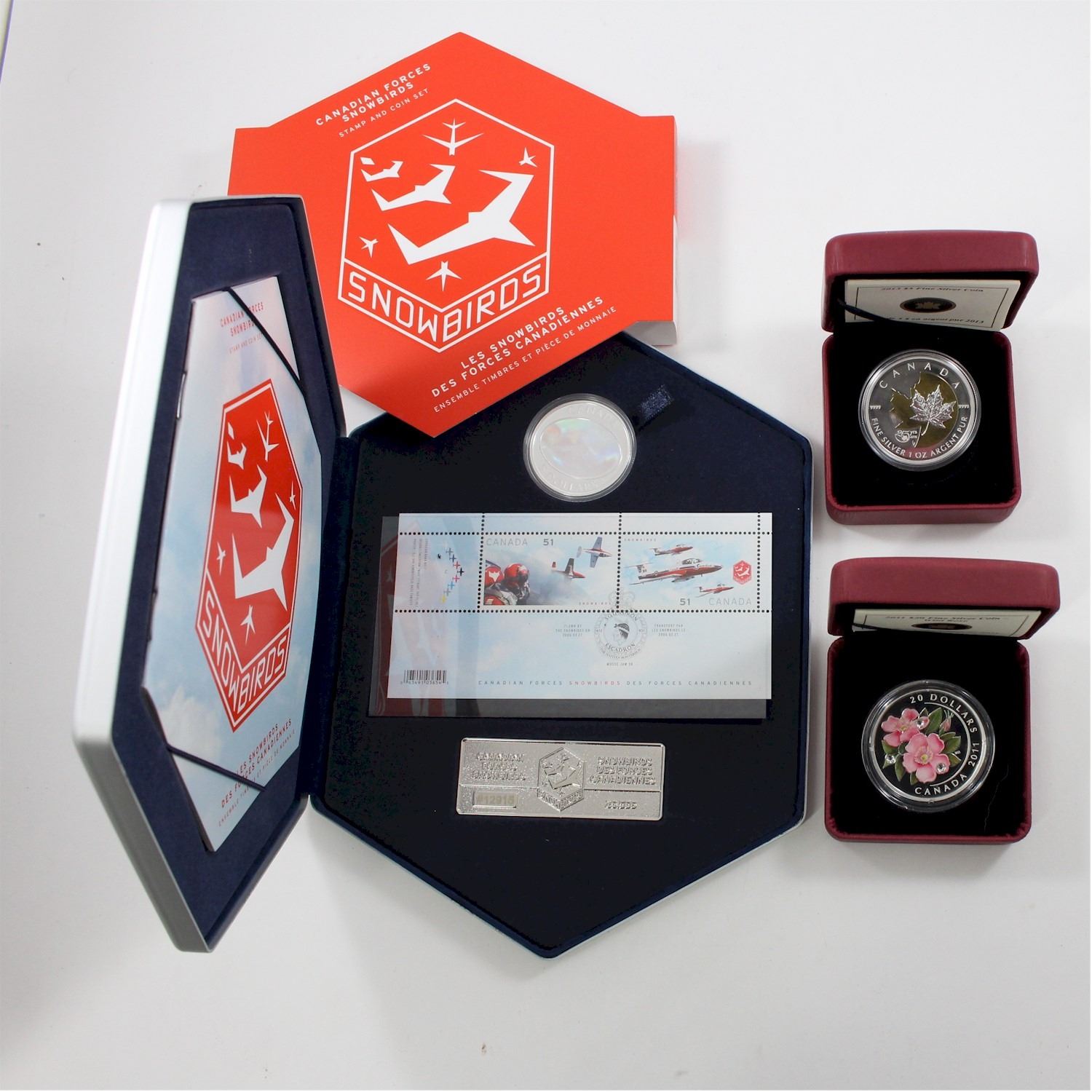 2006 Canada $5 Snowbirds Coin & Stamp Set, 2011 $20 Fine Silver Wild Rose (missing outer box) & 2013 Canada $5 25th Anniversary of the Silver Maple Leaf with Selective Gold Plating (missing outer box). Tax Exempt. 3pcs
