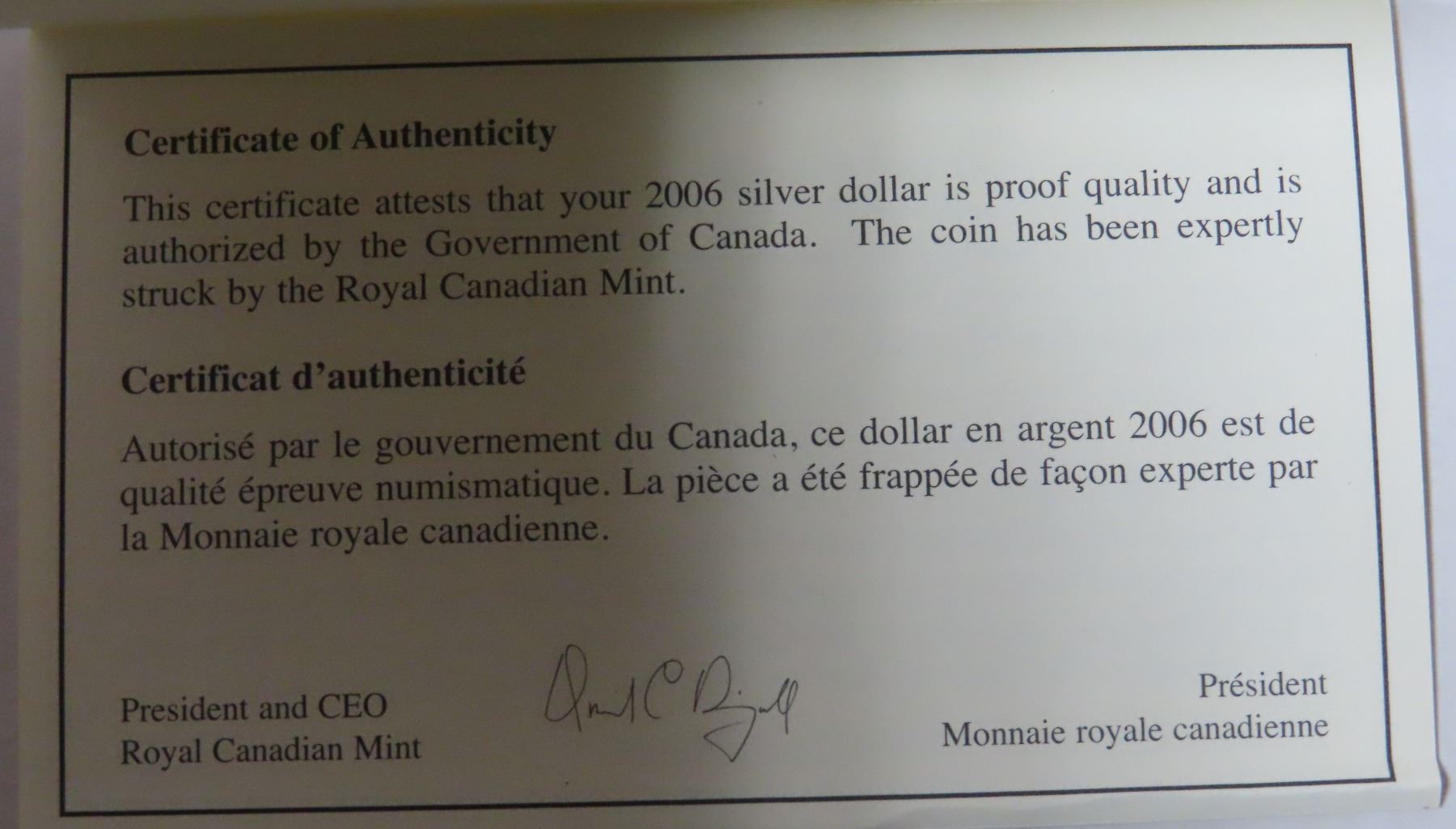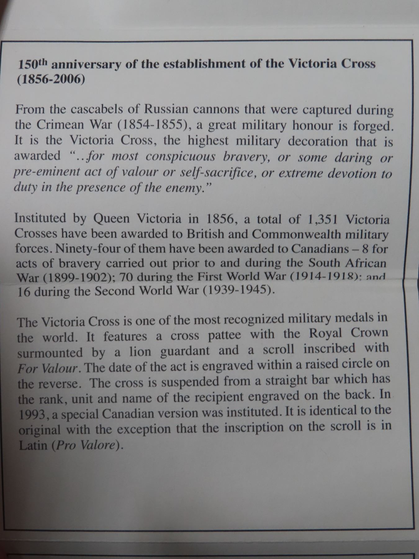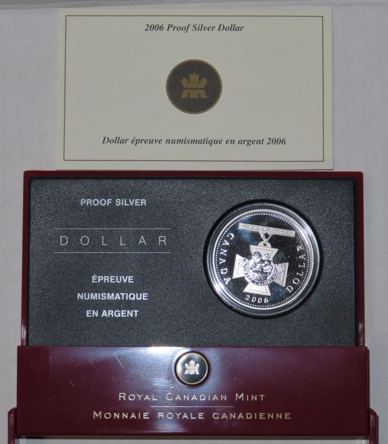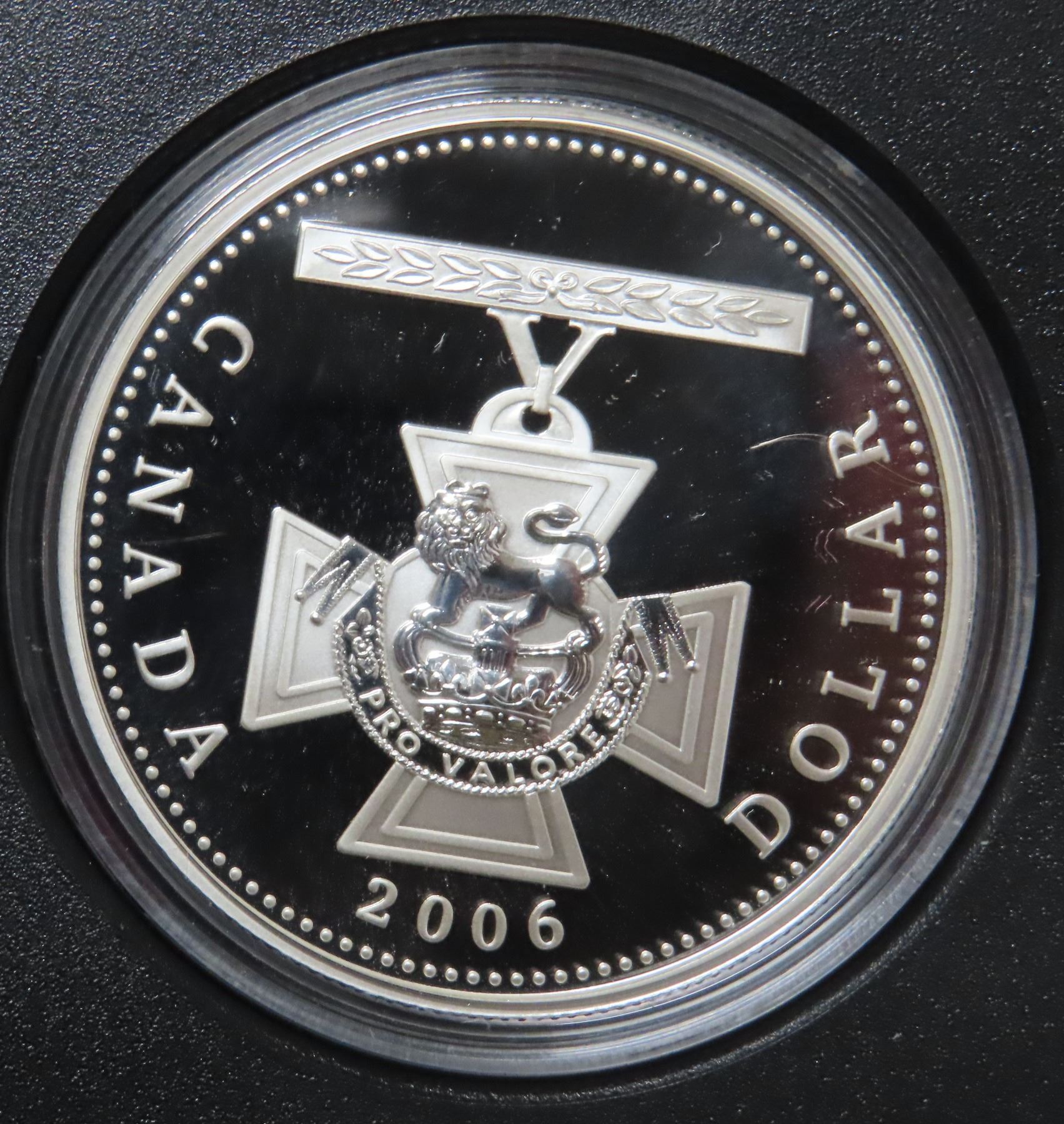 2006 Canadian Silver Dollar. Commemorates the 150th Anniversary of the Victoria Cross. 99.99% pure Silver. Proof with Ultra Heavy Cameo. Housed in its original case & box of issue.
