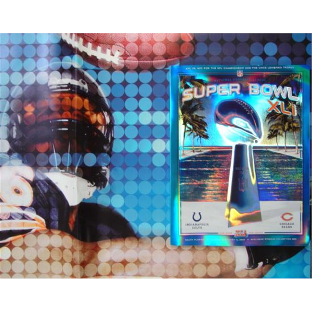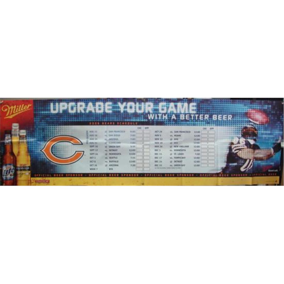 Here are 4 items from the terrific 2006 Chicago Bears. * The 3 ft x 10 ft vinyl banner brings you the full 2006 Chicago Bears schedule. You can even fill in the boxes to mark which team won each game. There are 6 grommet holes for hanging--stretch it across an entire wall! This banner has a cool Bears player image, big Bears C, and Miller Beer bottles. Its condition is excellent, with fold marks that are normal for this type of material. * The photos include two 8 x 10 full color collage images, one highlighting the Bears Defense, and the other celebrating their NFC Championship. Both are in Mint condition, in a plastic sleeve. * There is also a Super Bowl XLI Game Program, in mint condition, with shiny holograph cover. * The Bears were out in force in the 2006 season, and these items will give you inspiration for the 2007 season, and beyond.