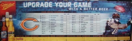 Here are 4 items from the terrific 2006 Chicago Bears. * The 3 ft x 10 ft vinyl banner brings you the full 2006 Chicago Bears schedule. You can even fill in the boxes to mark which team won each game. There are 6 grommet holes for hanging--stretch it across an entire wall! This banner has a cool Bears player image, big Bears C, and Miller Beer bottles. Its condition is excellent, with fold marks that are normal for this type of material. * The photos include two 8 x 10 full color collage images, one highlighting the Bears Defense, and the other celebrating their NFC Championship. Both are in Mint condition, in a plastic sleeve. * There is also a Super Bowl XLI Game Program, in mint condition, with shiny holograph cover. * The Bears were out in force in the 2006 season, and these items will give you inspiration for the 2007 season, and beyond.