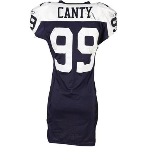 <B>2006 Chris Canty Game Worn Throwback Uniform.</B></I> Tons of dirty, sweaty wear tells the story of fierce battles of the line of scrimmage for this star Dallas Cowboys defensive end. Canty's number "99" and surname are applied in bold tackle twill to the mesh and dazzle cloth jersey, which sports "05-48" label inside collar and "Reebok" label in left front tail with "6" L.B." and "48" flap tags at right. Matching pants have number "99" in marker on interior waistband, and "Reebok" label with "42" and "S. INS." flap tags affixed. "04" year label sewn in waistband. Unbeatable provenance is delivered in the form of "Game Exclusives" paperwork, signed by the vice president of the Cowboys' merchandising department. <I>LOA from Game Exclusives. LOA from Lou Lampson.</B></I><BR><BR><b>Shipping:</b> Clothing, Costumes & Jerseys (<a target="_blank" href="http://www.heritageauctions.com/common/shipping.php">view shipping information</a>)