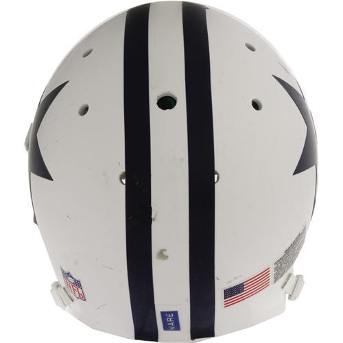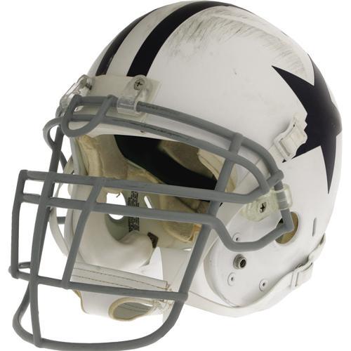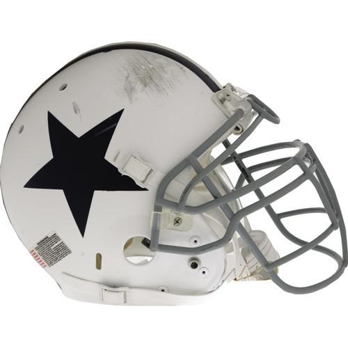 <B>2006 DeMarcus Ware Game Worn Throwback Helmet.</B></I> Heavy abrasions to the front exterior shell and face mask of this throwback helmet pay tribute to the rough style of play that earned Ware his first Pro Bowl appearance this season. Original chinstrap is here, affixed in its custom high hook-up position. Interior padding shows fine, sweaty wear. Dymo tape "Ware" applied to rear center stripe. Decals of the NFL logo, the American flag, and warning label are affixed in their proper positions. This could end up being a very valuable helmet if Ware continues to perform at the elite level we've seen in his first two seasons in the NFL.<BR><BR><b>Shipping:</b> Clothing, Costumes & Jerseys (<a target="_blank" href="http://www.heritageauctions.com/common/shipping.php">view shipping information</a>)