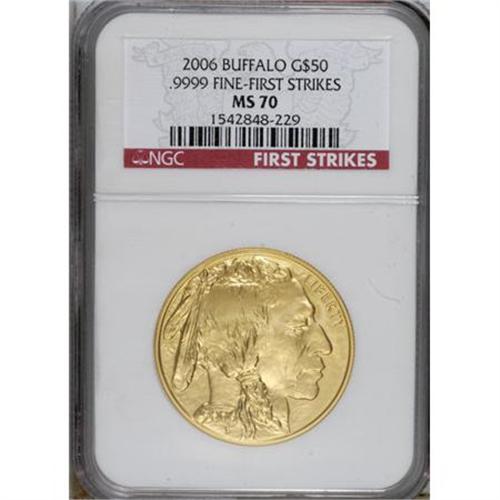 <B>2006 G$50 One-Ounce Buffalo Gold Eagle MS70 NGC.</B></I> .9999 Fine First Strikes. NGC Census: (0/0). PCGS Population (425/0). (#89988)<BR><BR><b>Shipping:</b> Coins & Currency (<a target="_blank" href="http://www.heritageauctions.com/common/shipping.php">view shipping information</a>)