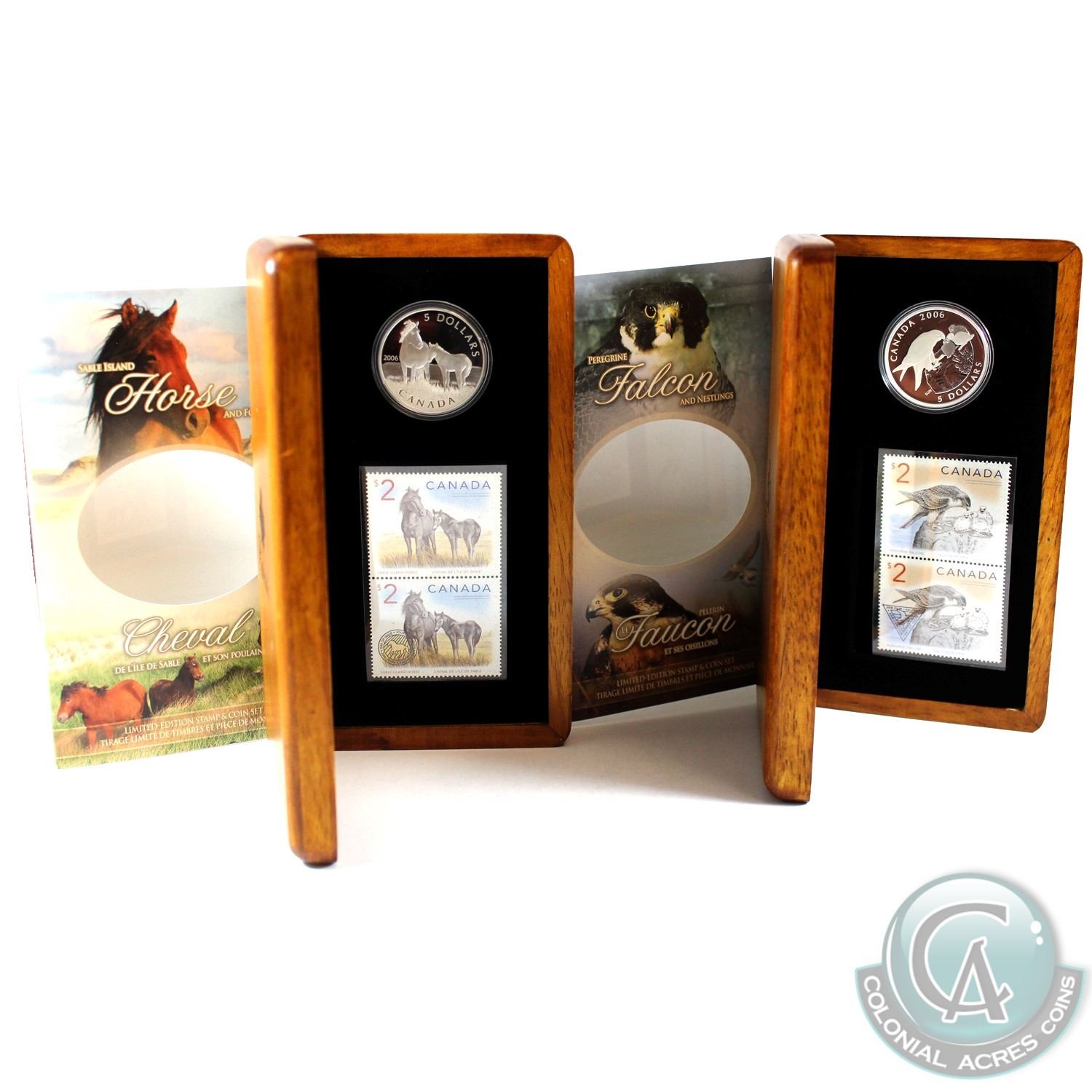 2006 Horse & Foal $5 & 2006 Peregrine Falcon & nestlings $5 Fine Silver Coin and Stamp Sets. 2 sets