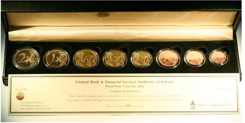 Limited edition, set #4996 of only 5000 issued. Sold out in Ireland. Original 8 coin set containing proof versions of the circulating range of the Irish euro coins. Issued by the Central Bank & Financial Services Authority of Ireland and minted by the Mint of Finland Ltd. Complete with certificate and displayed in black leather case.