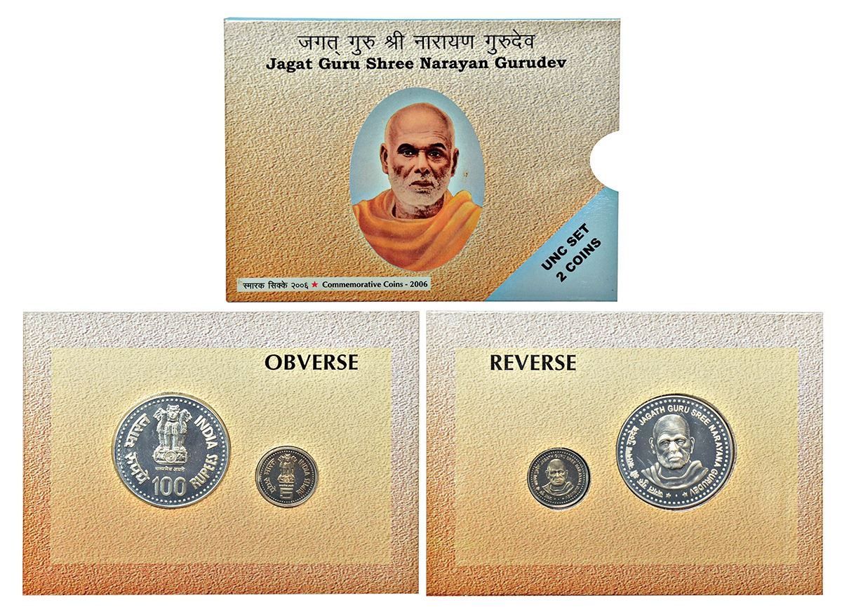 2006, Jagat Guru Shree Narayan Gurudev, UNC set of 2 coins, 100 rupees and 5 rupees, Mumbai mint, RB 304, in original mint packing.