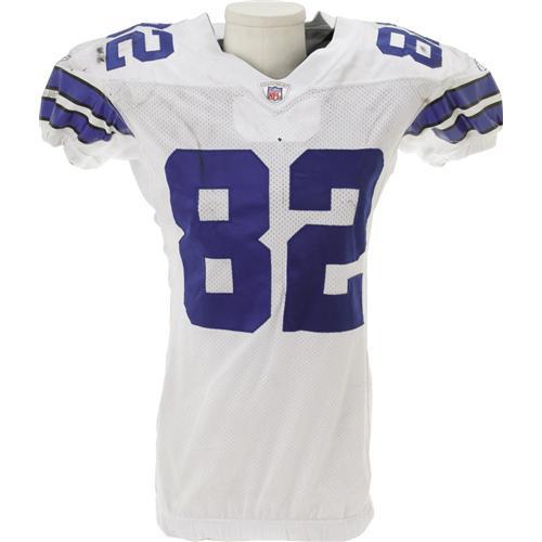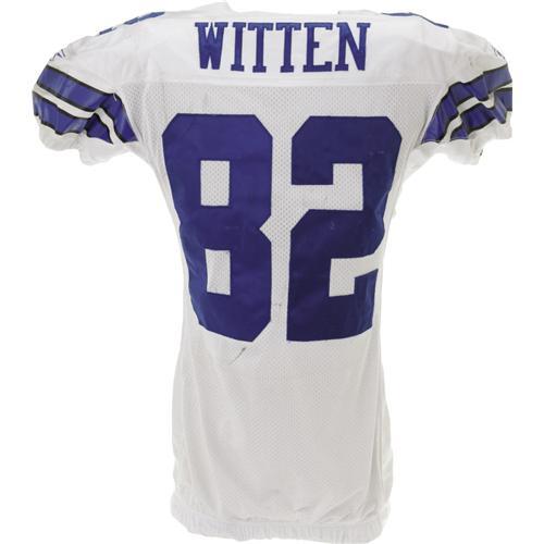 <B>2006 Jason Witten Game Worn Jersey.</B></I> The heavy black staining on the shoulders of this star tight end's jersey is symptomatic of collisions with the black facemasks of New Orleans Saints tacklers, suffered in the second of two games of NFL action. Witten picked up thirty-three yards that day, and seventy-three the week before at the New York Giants. Number "82" is stitched to chest, back and shoulders in blue tackle twill, with "Witten" sewn across rear nameplate in bold block lettering. "06-48" year/size label appears inside collar, with tail tagging lost to the custom elasticized waistband tailoring.<BR><BR><b>Shipping:</b> Clothing, Costumes & Jerseys (<a target="_blank" href="http://www.heritageauctions.com/common/shipping.php">view shipping information</a>)