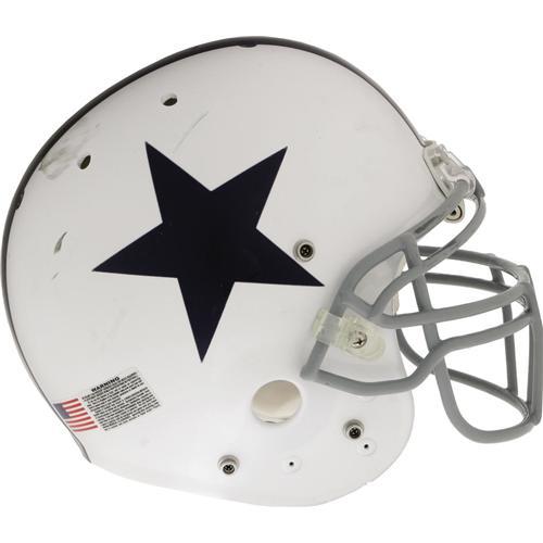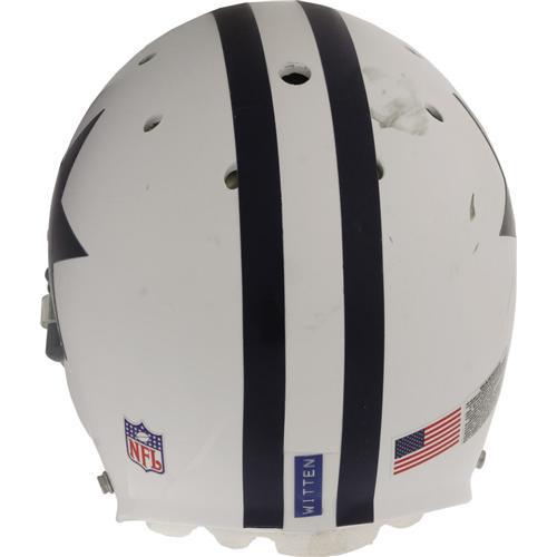 <B>2006 Jason Witten Game Worn Throwback Helmet.</B></I> Some heavy gashes in the white shell of this retro gamer illustrate the sort of hard-nosed style the big fourth year tight end out of Tennessee favors. Note the heavy abrasions on the facemask as well. Custom padding at brow to soak up sweat is still present as well. Dymo tape "Witten" applied to rear center stripe. Decals of the NFL logo, the American flag, and warning label are affixed in their proper positions. Witten picked up thirty and fifty yards respectively in the Bucs and Eagles games this helmet saw action.<BR><BR><b>Shipping:</b> Clothing, Costumes & Jerseys (<a target="_blank" href="http://www.heritageauctions.com/common/shipping.php">view shipping information</a>)