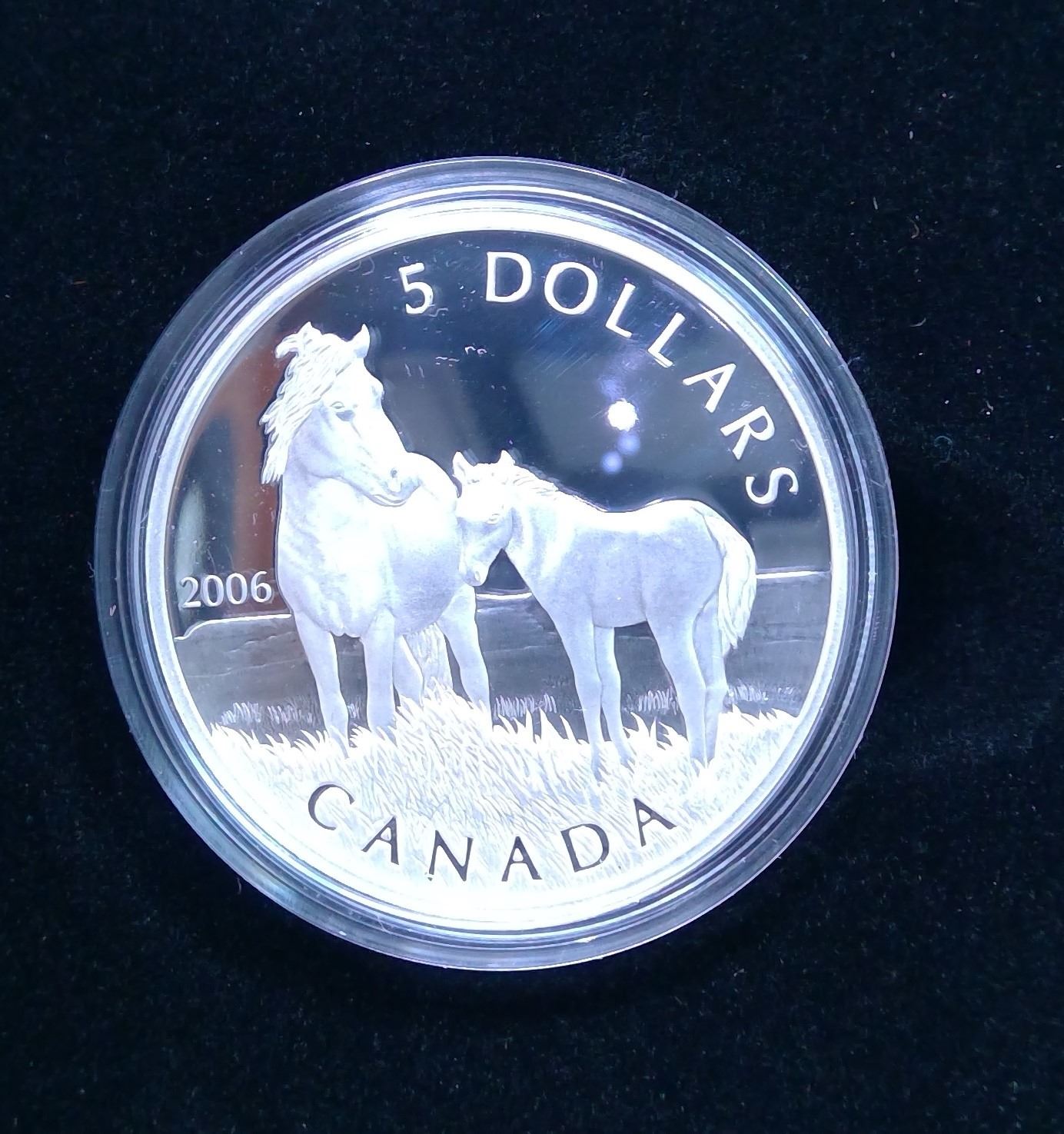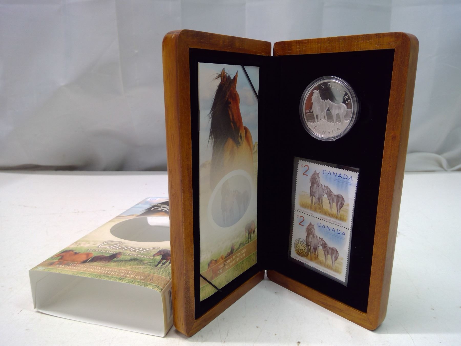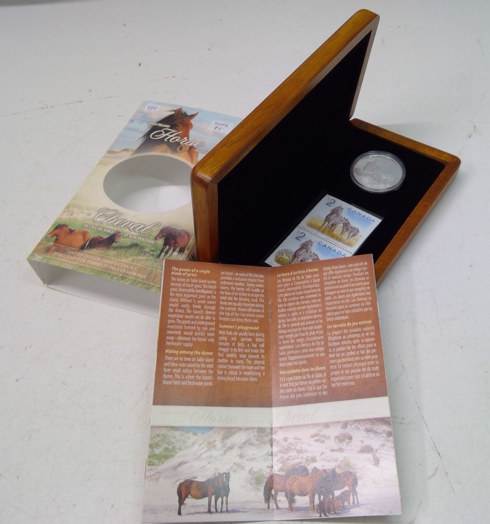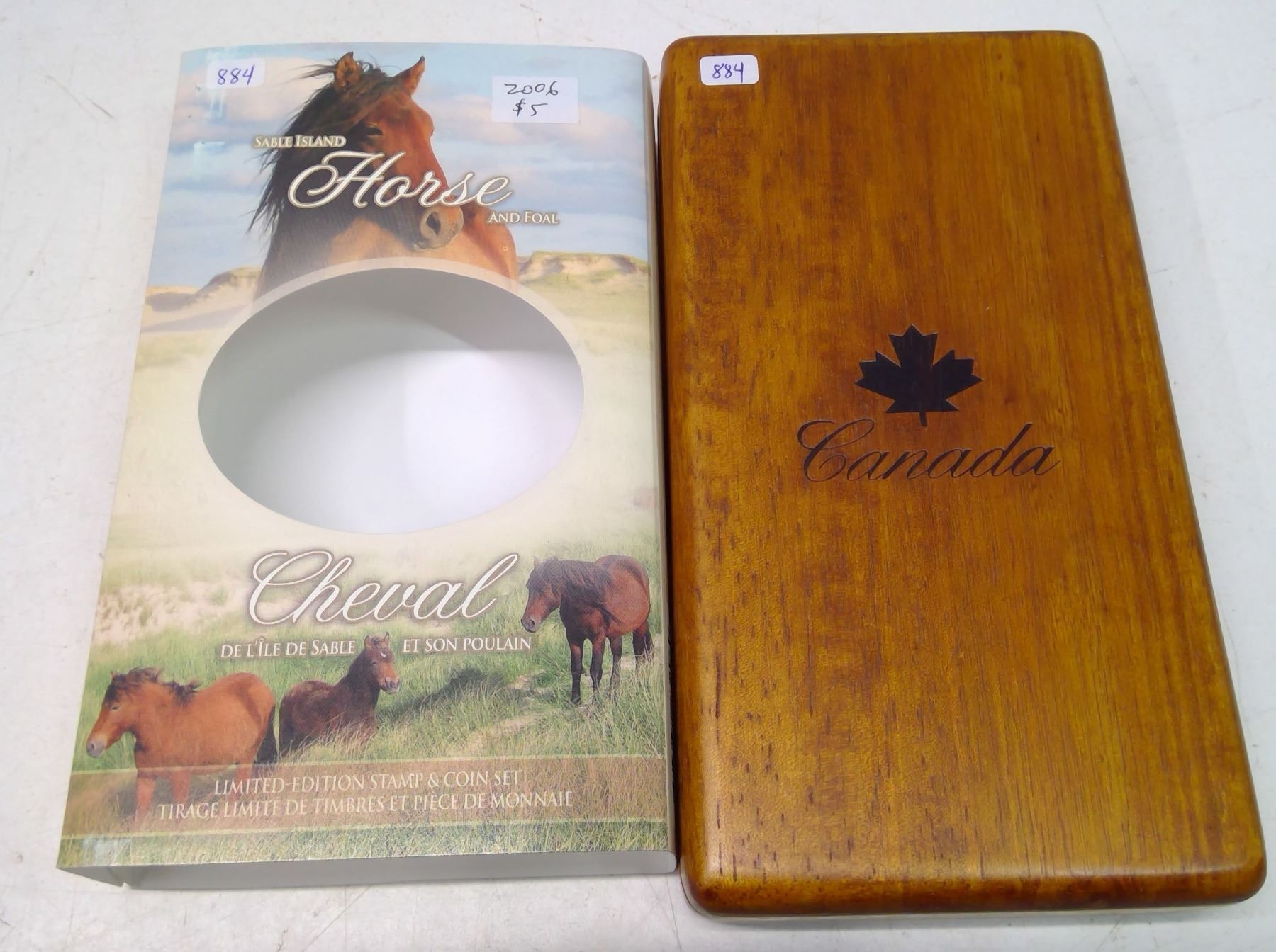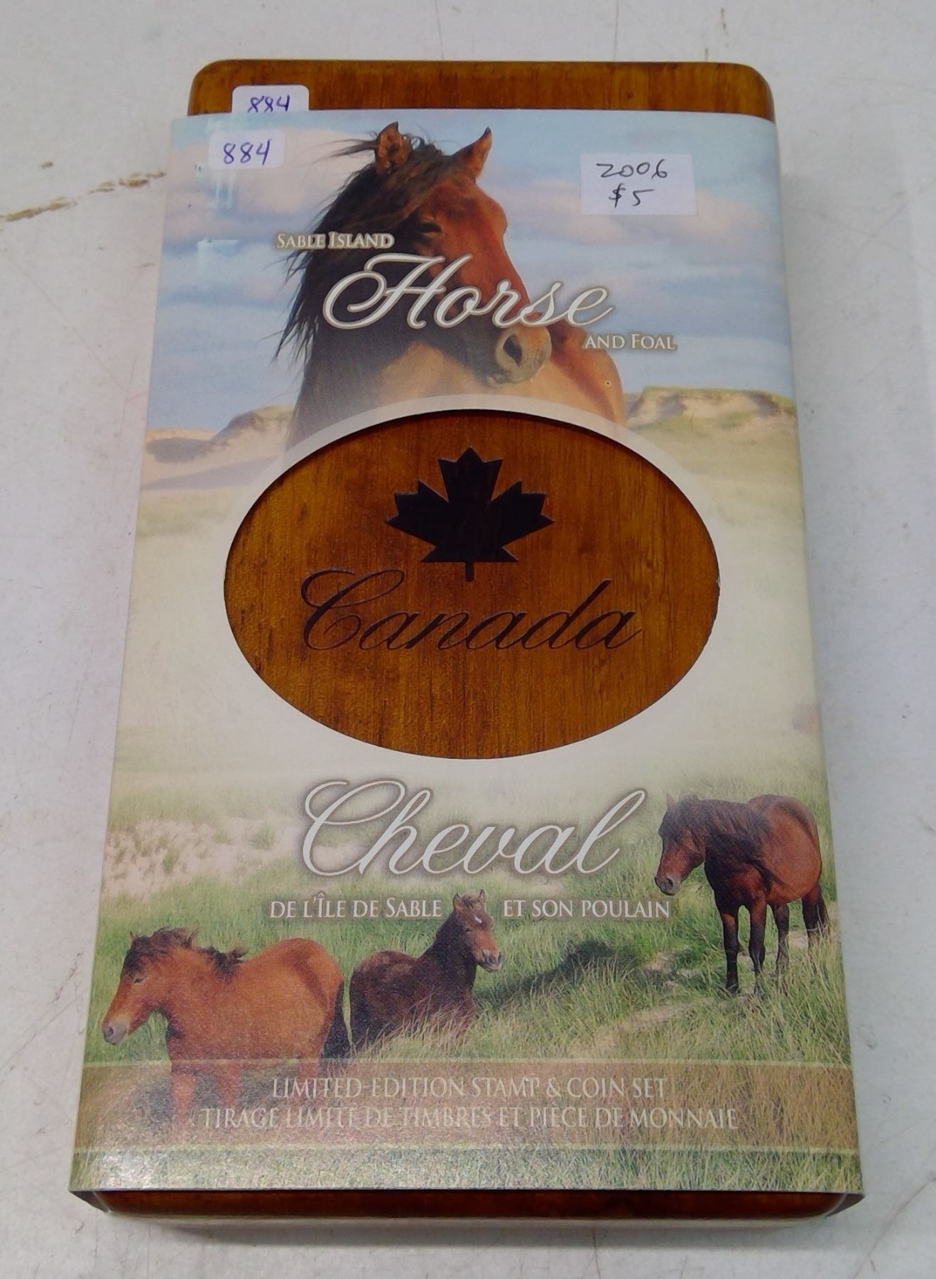 2006 Limited Edition Sable Island Horse & Foal $5 Stamp & Coin Set. Includes 2 $2 Stamps. The coin is 99.99% pure Silver. Proof with Ultra Heavy Cameo. Housed in its original Royal Canadian Mint case & box of issue. Includes Certificate of Authenticity.