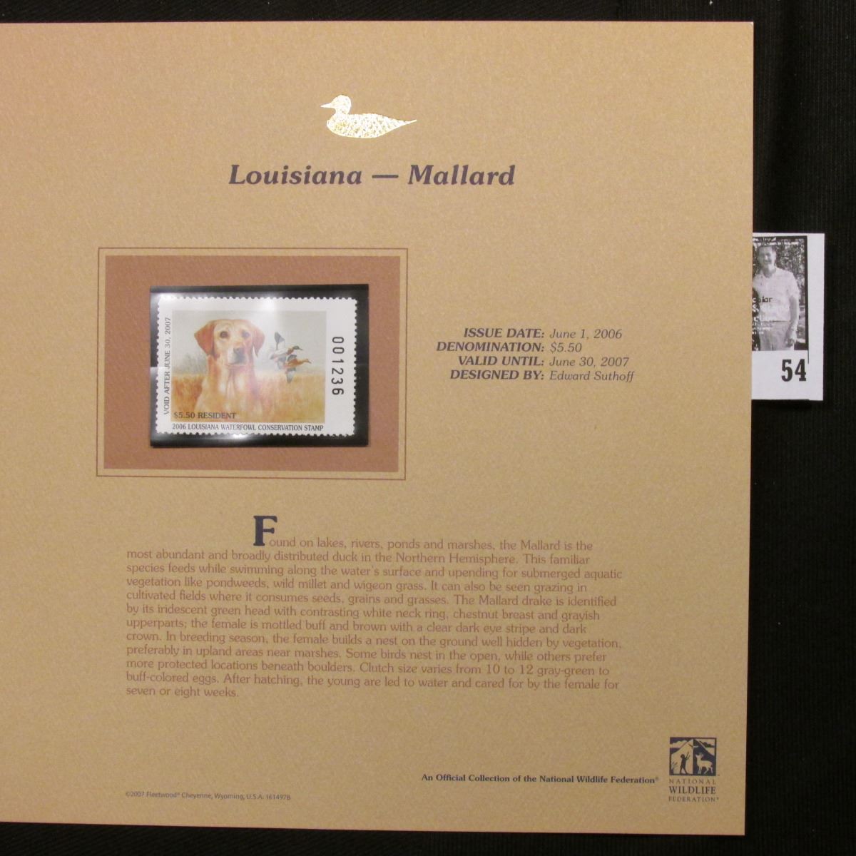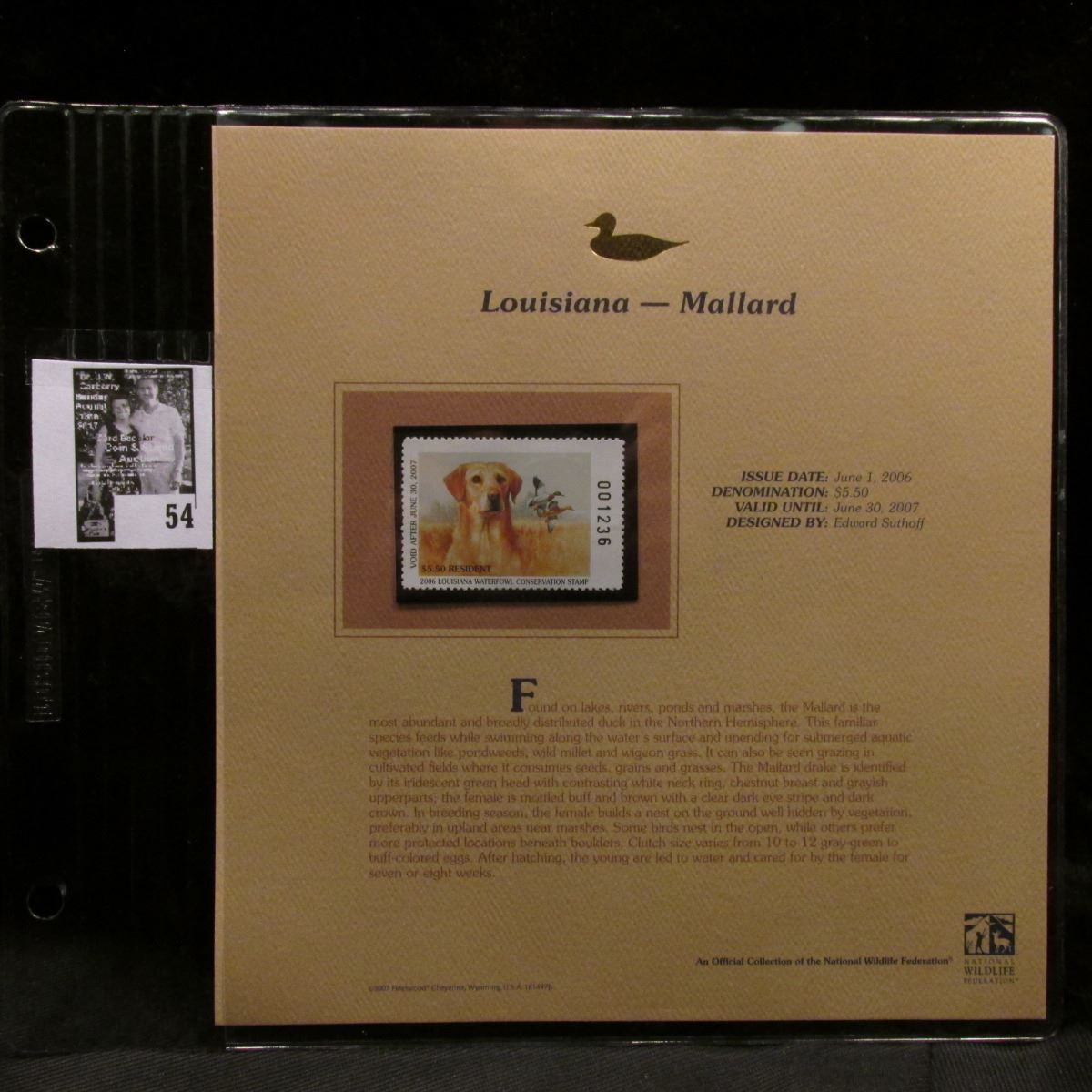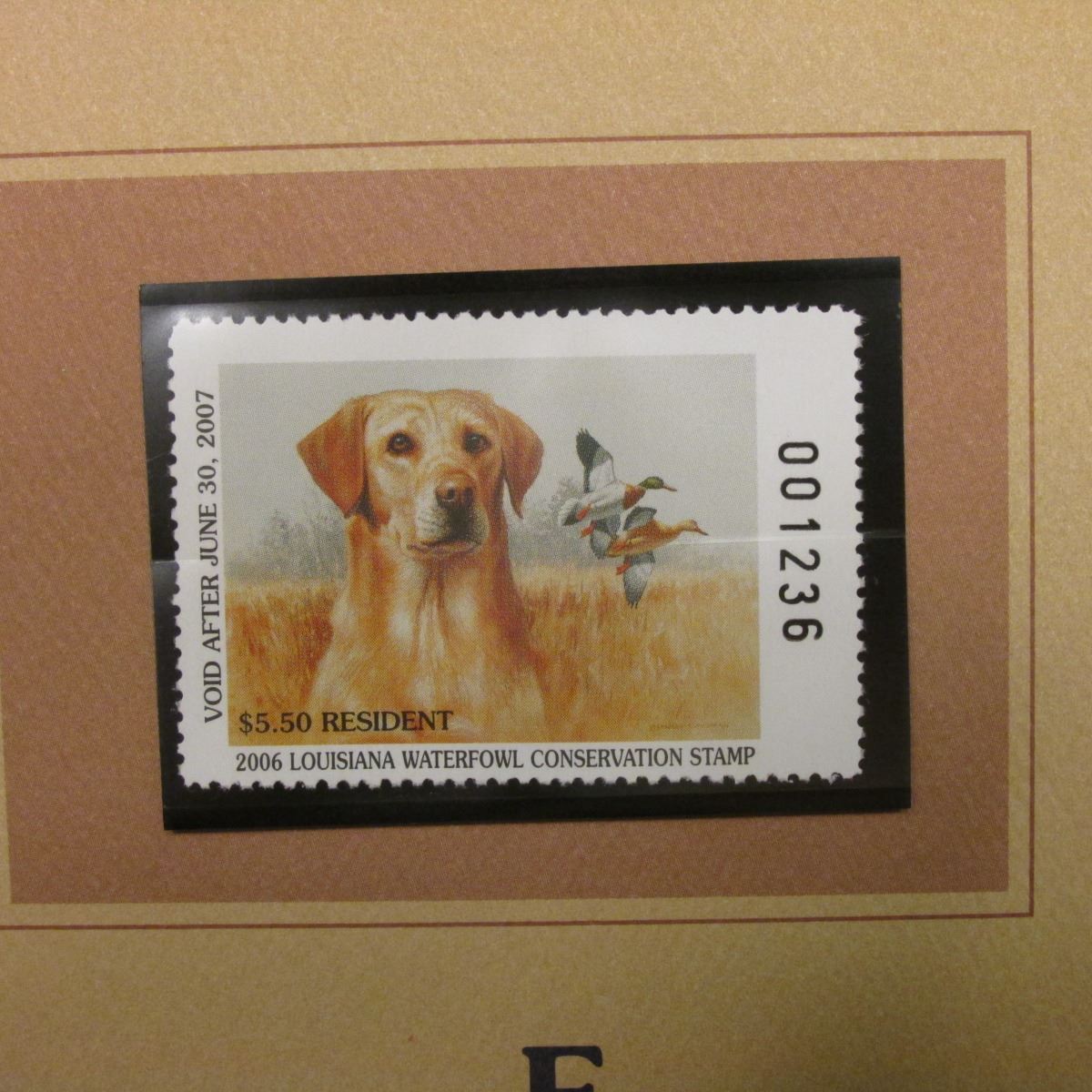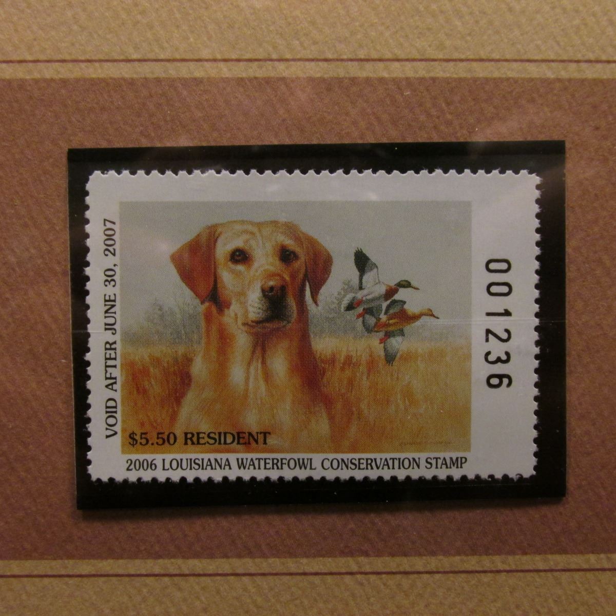 2006 Louisiana Waterfowl Conservation $5.50 Stamp depicting a Yellow Lab with Mallard Ducks in background, Pristine Mint condition in plastic page with literature.