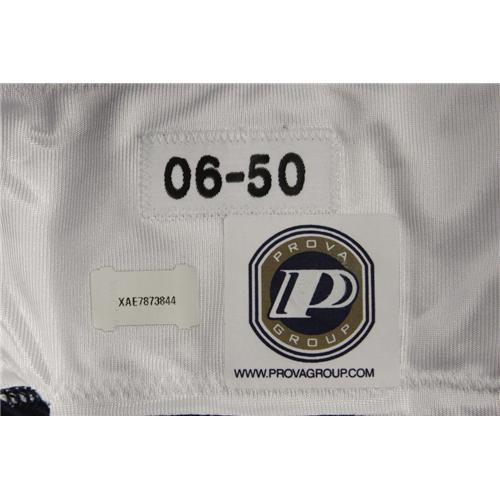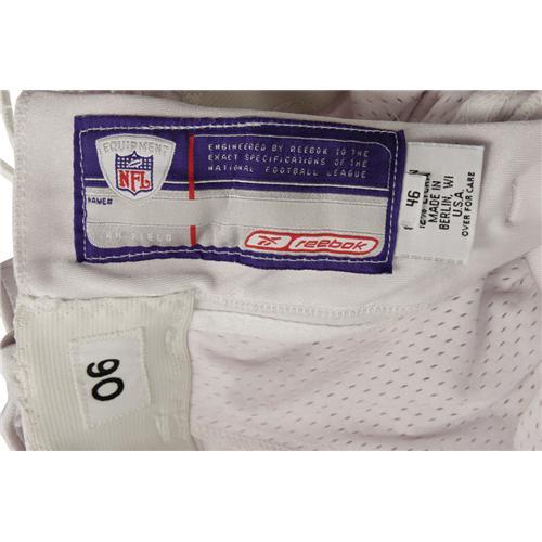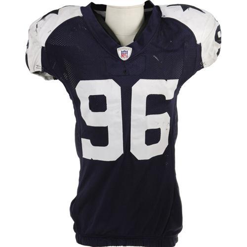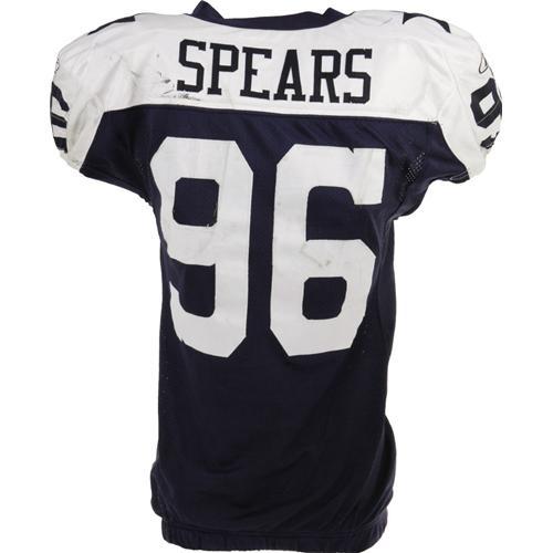 <B>2006 Marcus Spears Game Worn Throwback Uniform.</B></I> The first round draft pick out of LSU recorded forty-five tackles during the 2006 season, with seven coming while wearing this beautiful uniform recalling the first decade of Cowboys football. The three hundred pound defensive end's jersey is a mass of scuffs and scrapes, and the left pant leg is stained with blood. Number "96" appears on the jersey's chest, back and shoulders, and inside the pants' waistband in black marker. Jersey features shortened, elasticized sleeves favored by big men, and "06-50" label inside collar. Jersey tail is elasticized as well. Pants feature "Reebok" labeling with "46" flap tag and "06" year tag. A quick examination of this uniform will convince your wife never to let your son play football again.<BR><BR><b>Shipping:</b> Clothing, Costumes & Jerseys (<a target="_blank" href="http://www.heritageauctions.com/common/shipping.php">view shipping information</a>)