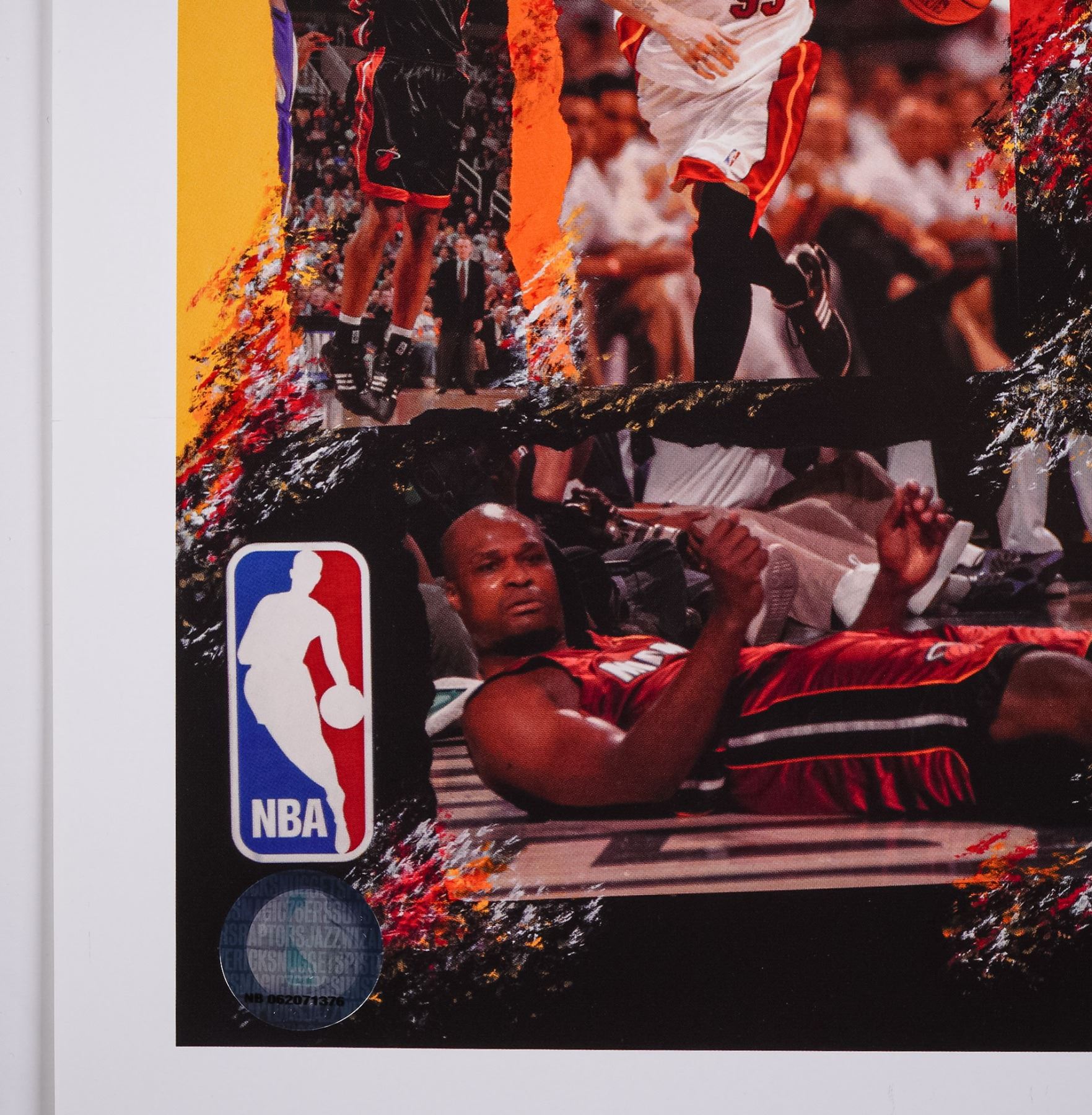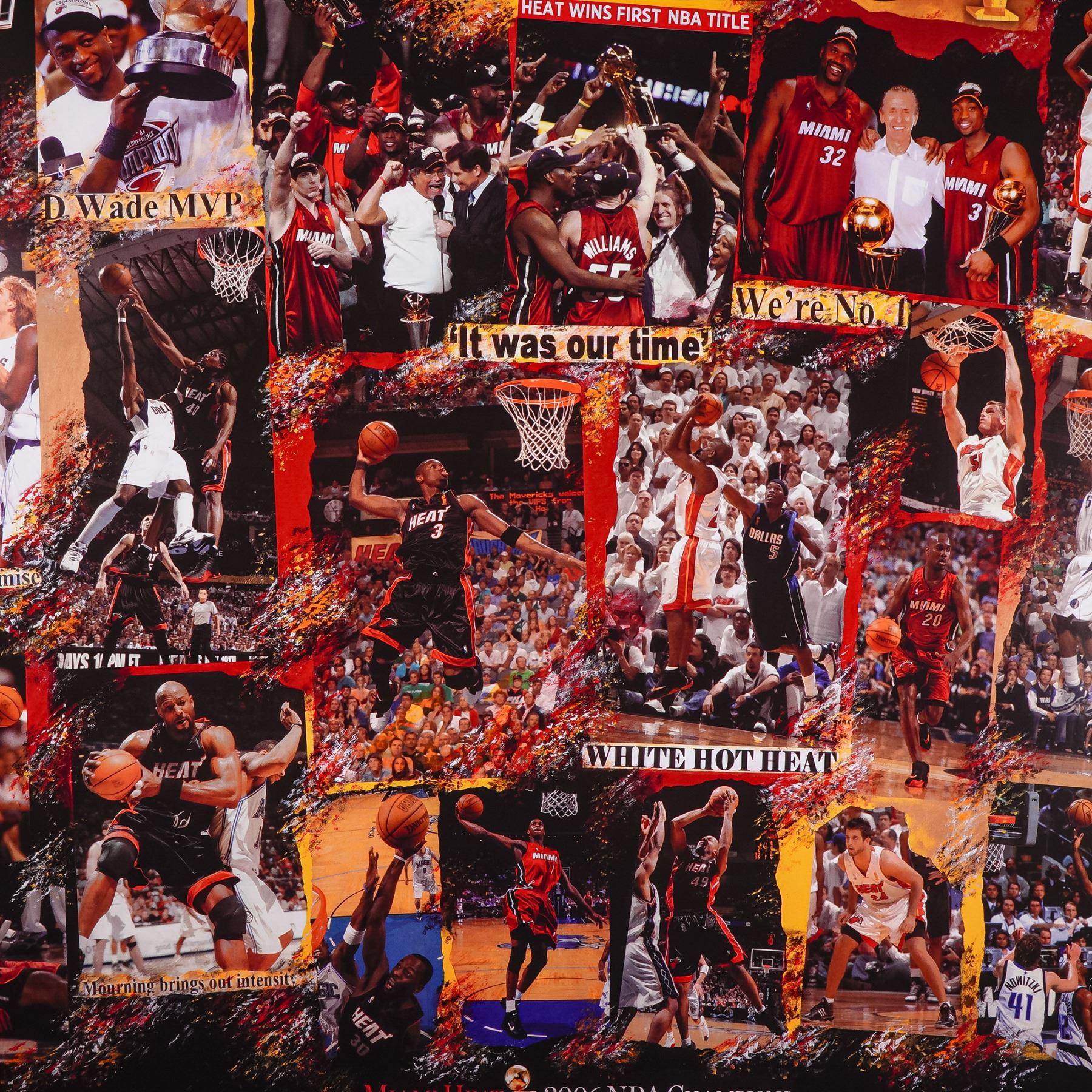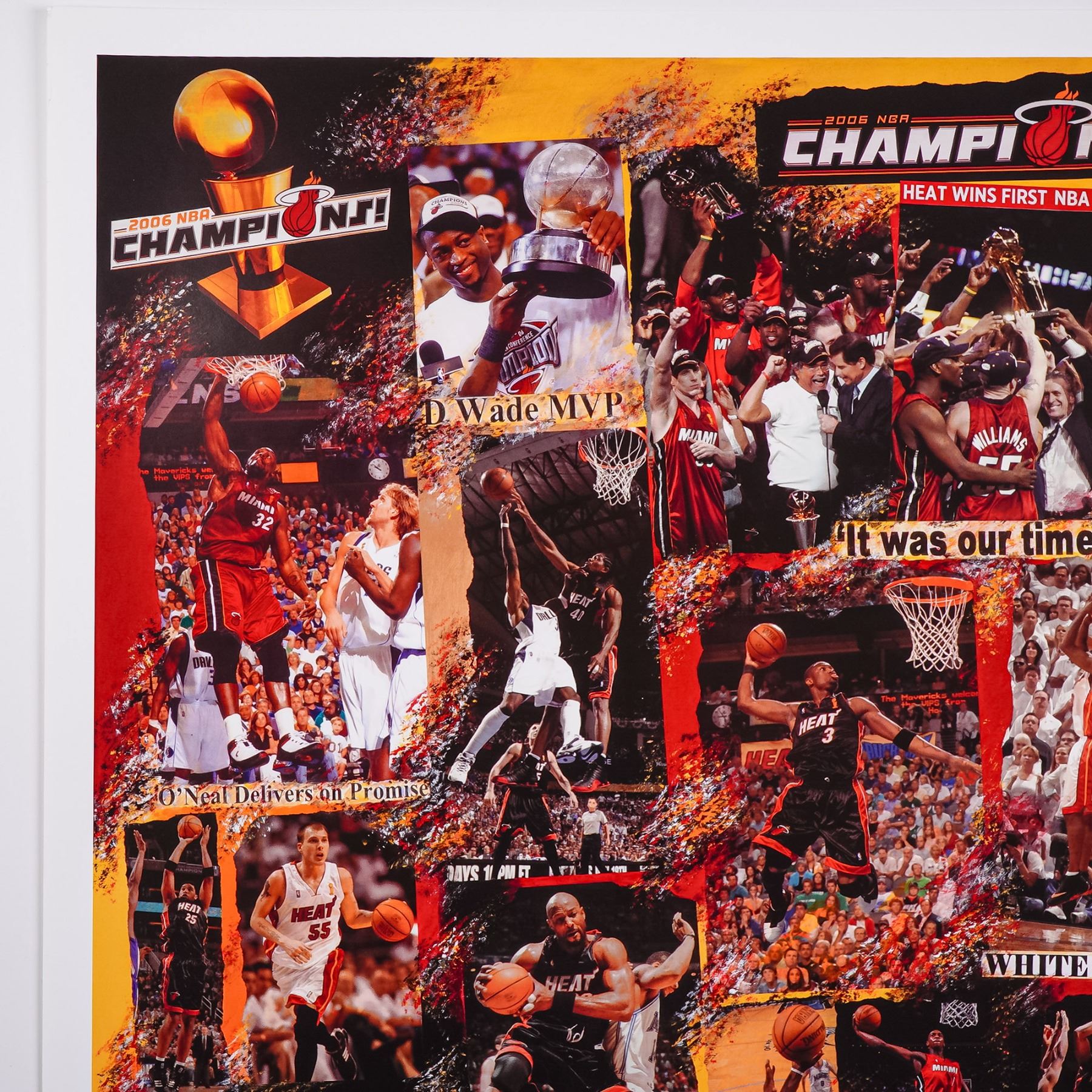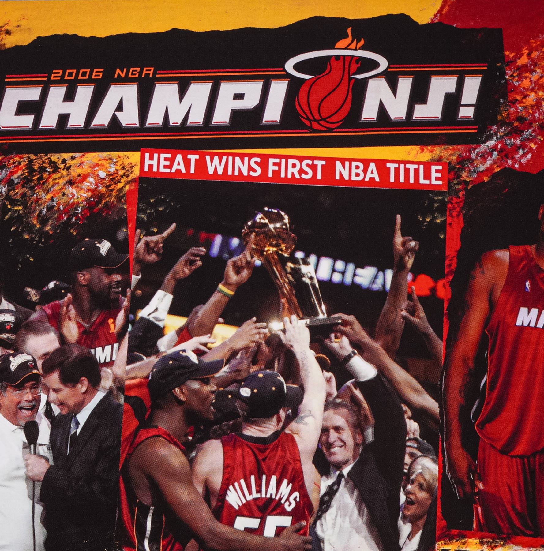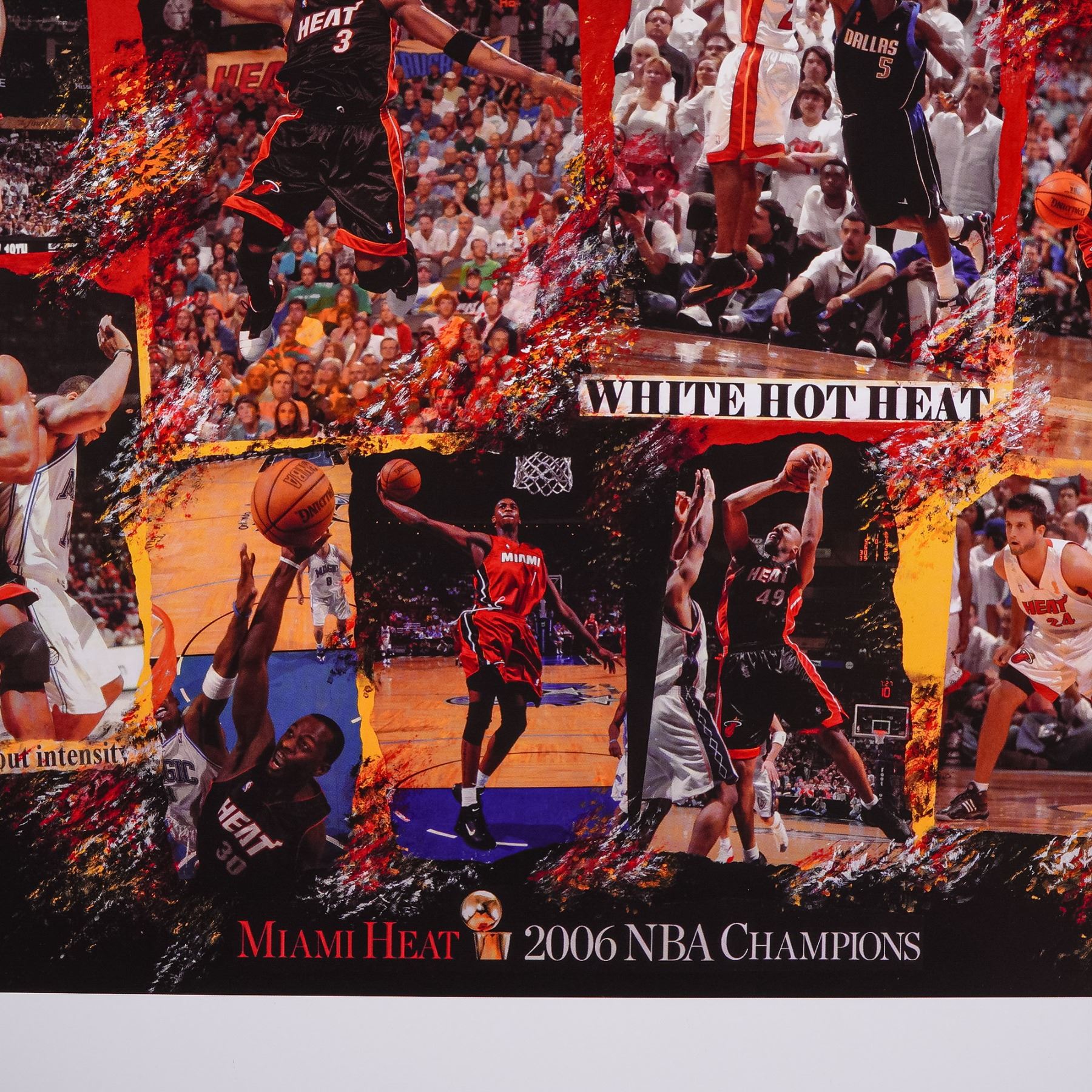 Celebrate the unforgettable moment when the Miami Heat clinched their first-ever NBA Championship in 2006 with this vibrant commemorative poster. Bursting with energy, this collage captures the key highlights of the Finals victory over the Dallas Mavericks, featuring star players Dwyane Wade, Shaquille O'Neal, Alonzo Mourning, Jason Williams, and more. The design showcases iconic moments from the Finals series, including Wade's MVP performance, the celebratory trophy lift, and the team's relentless "15 Strong" playoff run. The poster features bold colors and dynamic graphics with phrases such as "D. Wade MVP," "Heat Wins First NBA Title," and "White Hot Heat," perfectly capturing the excitement of the Heat's journey to glory. Officially licensed by the NBA, it includes the authentic holographic NBA logo for verified authenticity, making it a must-have for collectors and fans alike.