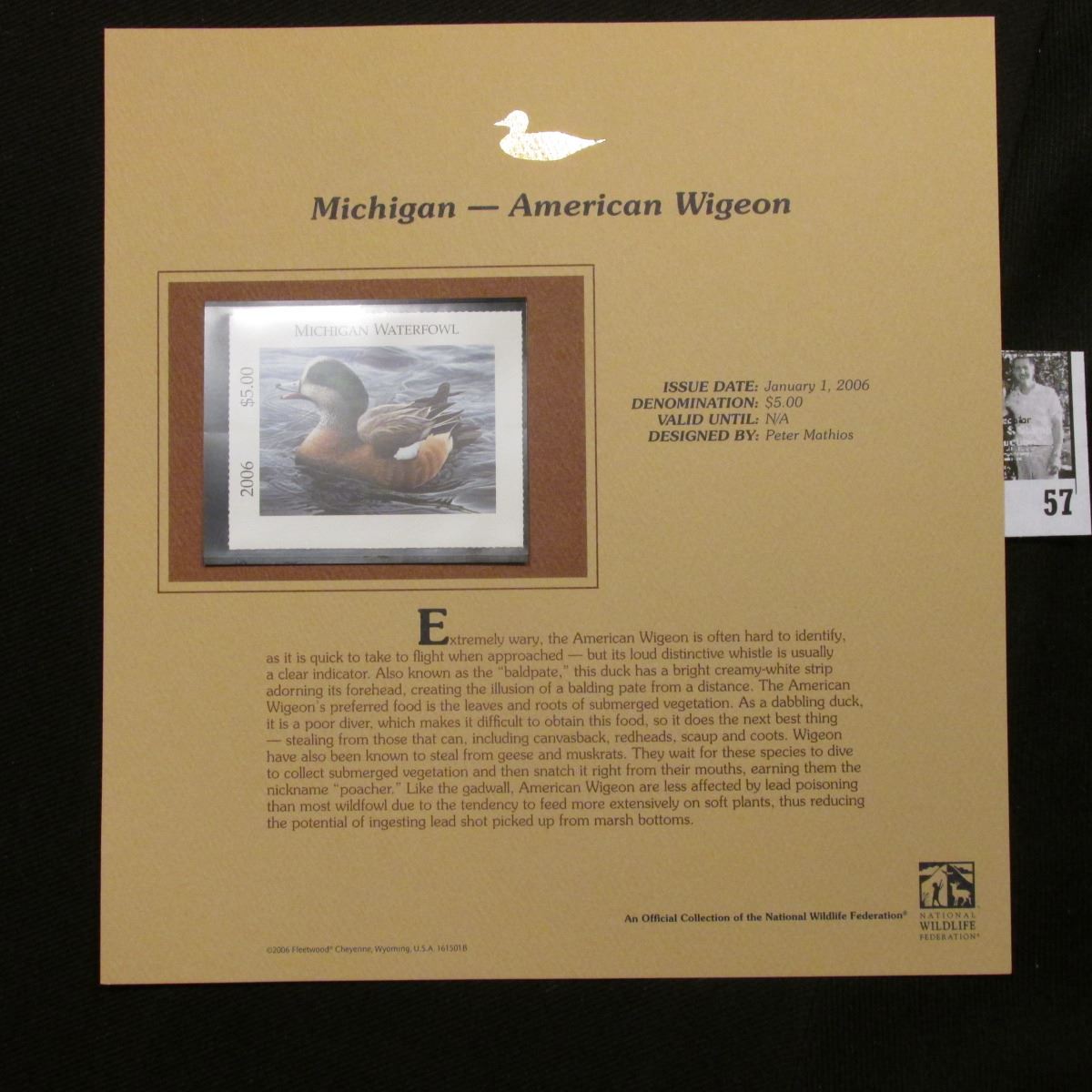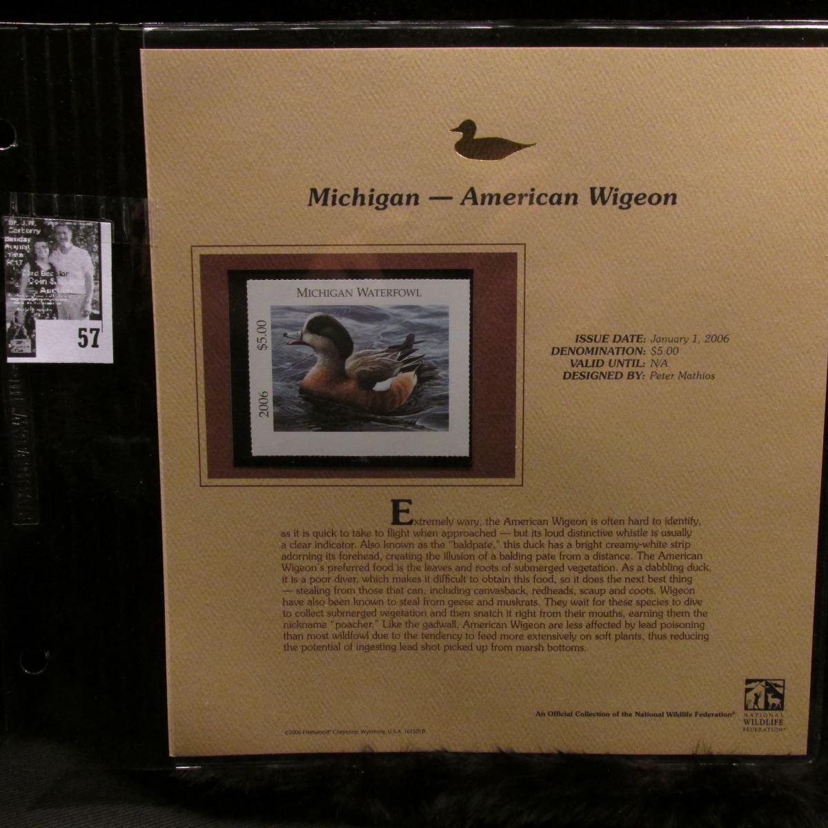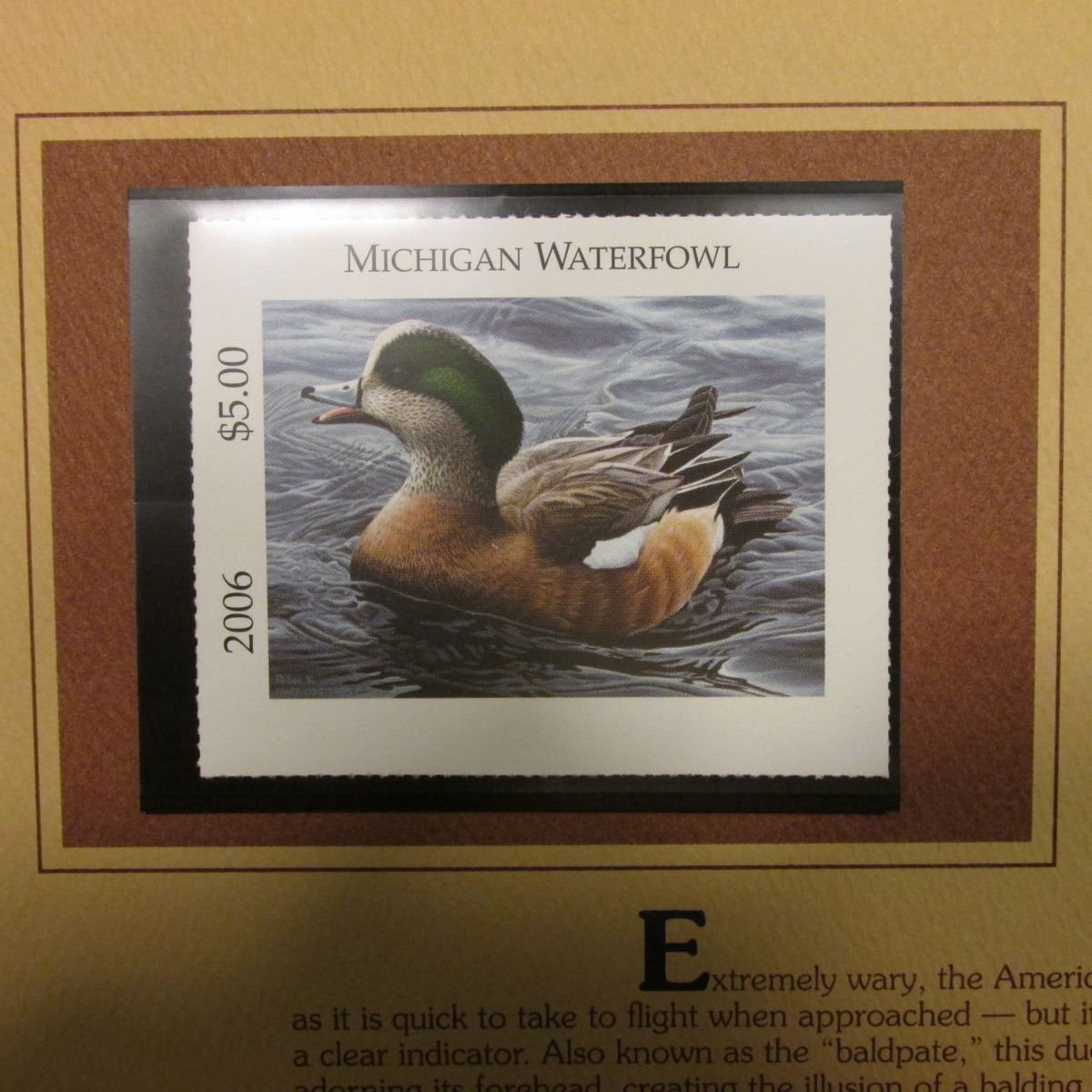 2006 Michigan Waterfowl $5 Stamp depicting American Widgeon Duck, Pristine Mint condition in plastic page with literature