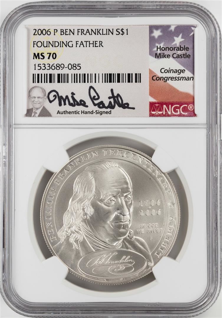 2006-P $1 Ben Franklin Founding Father Silver Dollar Coin NGC MS70 Mike Castle Signature
