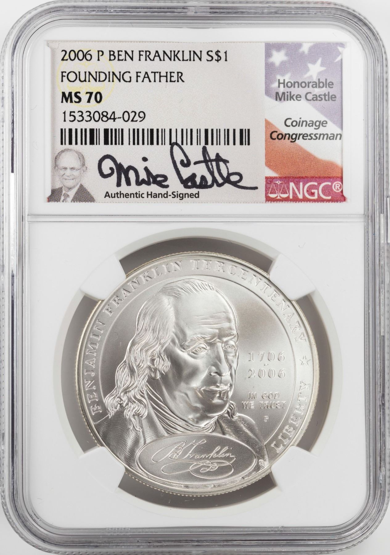 One 2006-P $1 Ben Franklin Founding Father Silver Dollar Coin NGC MS70 Mike Castle Signature.