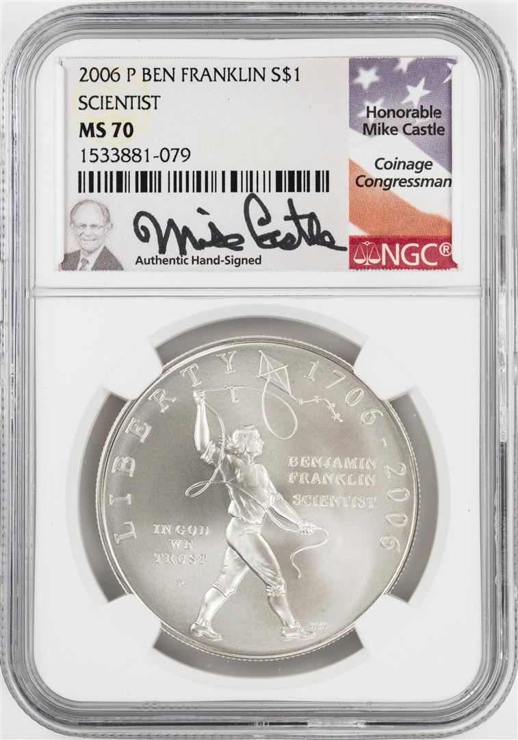 One 2006-P $1 Ben Franklin Scientist Silver Dollar Coin NGC MS70 Mike Castle Signature. NGC Certified.