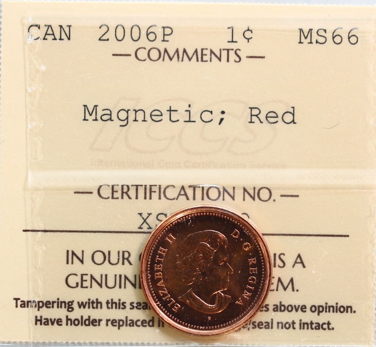 2006-P 1¢  Magnetic  ICCS Superb Gem Mint State-66 Full red.