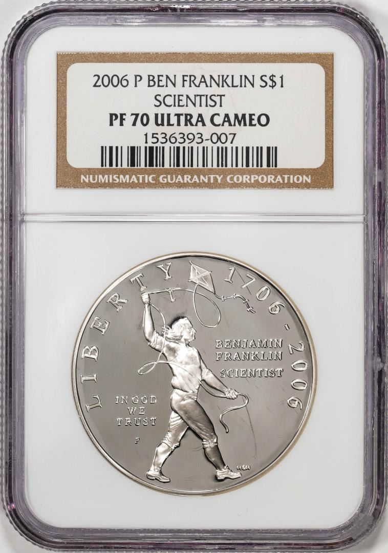 One 2006-P $1 Proof Ben Franklin Scientist Silver Dollar Coin NGC PF70 Ultra Cameo. NGC Certified.