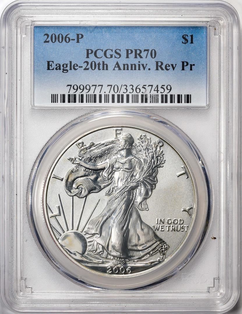 2006-P $1 Reverse Proof American Silver Eagle Coin PCGS PR70 20th Anniversary