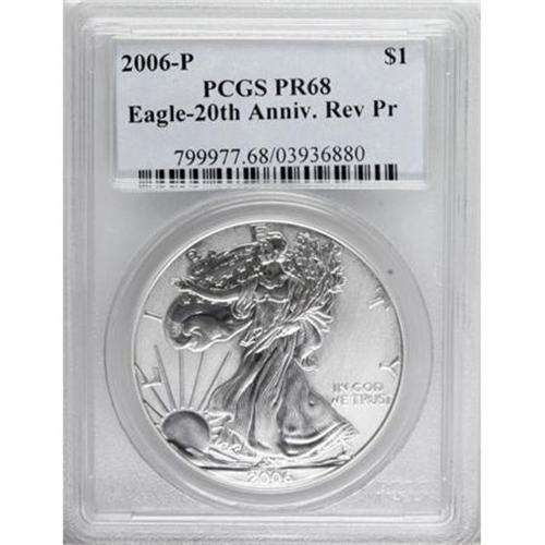 <B>2006-P $1 Eagle 20th Anniversary Reverse Proof PR68 PCGS.</B></I> PCGS Population (437/8672). NGC Census: (0/0). (#799977)<BR><BR><b>Shipping:</b> Coins & Currency (<a target="_blank" href="http://www.heritageauctions.com/common/shipping.php">view shipping information</a>)