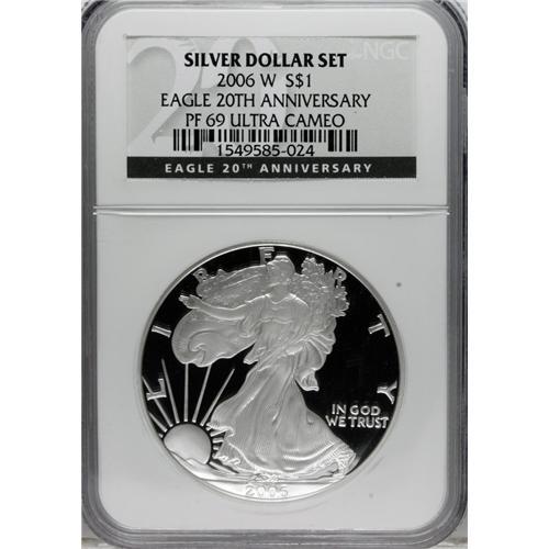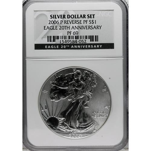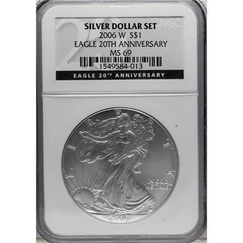 <B>2006-P $1 Reverse Proof PR69 NGC; 2006-W MS69 NGC;</B></I> and a <B>2006-W PR69 Deep Cameo NGC. All lots are designated as Eagle 20th Anniversary by NGC.</B></I><BR><BR><b>Shipping:</b> Coins & Currency (<a target="_blank" href="http://www.heritageauctions.com/common/shipping.php">view shipping information</a>)