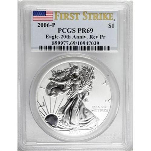 <B>2006-P $1 Eagle 20th Anniversary Reverse Proof PR69 PCGS.</B></I> PCGS Population (2291/283). NGC Census: (0/0). (#899977)<BR><BR><b>Shipping:</b> Coins & Currency (<a target="_blank" href="http://www.heritageauctions.com/common/shipping.php">view shipping information</a>)